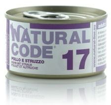 Natural Code Cat 17 Chicken and ostrich to karma uzupełniająca. Połączenie kawałków mięsa kurczaka i strusia, by dać kotom to, co najlepsze. Kurczak jest lekko strawny i daje podstawowe dla zwierzęcia składniki, a dodatek w postaci mięsa strusia uzupełnia dietę kota. Struś jest doskonałym pokarmem dla kota, ponieważ jego mięso jest wyjątkowo delikatne i ma niską zawartość tłuszczu. Ponadto, ponieważ należy ono do kategorii czerwonego mięsa, jest źródłem żelaza i witamin z grupy B. W składzie znajduje się także niewielka ilość ryżu, która dostarcza łatwo przyswajalnych węglowodanów.