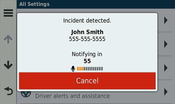 Ani Ty, ani Twoi bliscy nie musicie się już martwić, wiedząc, że w razie zdarzenia drogowego wskazane osoby zostaną niezwłocznie o tym powiadomione. Urządzenie wyśle zdefiniowanym przez Ciebie kontaktom automatyczną wiadomość tekstową4, chyba że ją wcześniej anulujesz na wyświetlonym ekranie. Taka wiadomość tekstowa zawiera mapę wskazującą miejsce wystąpienia zdarzenia.