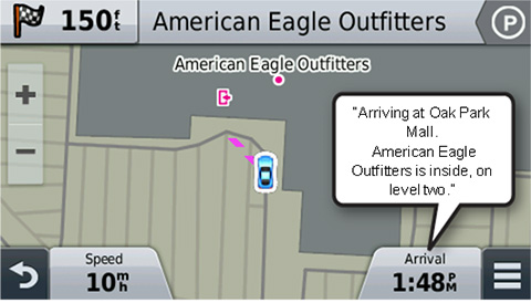 Funkcja Direct Access ułatwia nawigację do wybranych złożonych celów podróży, takich jak lotniska czy centra handlowe, dzięki temu, że pozwala wyszukać miejsca w obrębie większego kompleksu. Funkcja Direct Access umożliwia nawet nawigację po parkingach w celu wyszukania wjazdu znajdującego się najbliżej celu podróży. Podczas podróży na zakupy funkcja Direct Access zapewnia dodatkowe informacje o konkretnych sklepach detalicznych znajdujących się w centrum handlowym. Na przykład: „Przybycie do centrum handlowego Woodfield Mall. Kwiaciarnia znajduje się wewnątrz centrum handlowego, na górnym piętrze”.