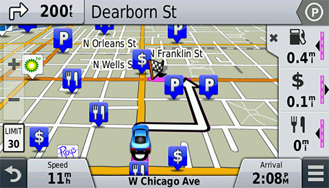 Nie trzeba już szukać trudnych do odczytania bądź nieistniejących tablic — wystarczy spojrzeć na urządzenie nüvi 57LM, aby przeczytać nazwę aktualnej ulicy. Urządzenie nüvi wyświetla też ograniczenie prędkości, aktualną prędkość i czas przybycia.