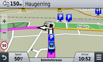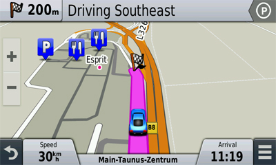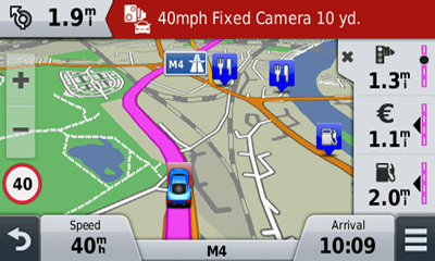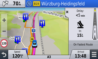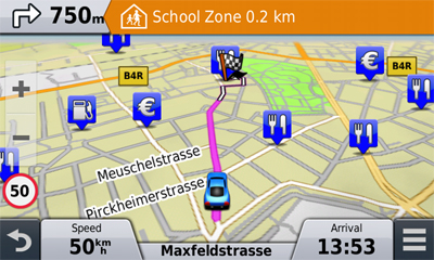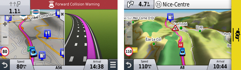 Urządzenie nüviCam LMT-D cały czas wyświetla na ekranie mapę podróży, a dodatkowe informacje są wyświetlane obok. Podczas jazdy wybraną trasą funkcja „Przed tobą” stale informuje o usługach w pobliżu, takich jak punkty gastronomiczne, stacje benzynowe i bankomaty. Inne przydatne informacje wyświetlane na ekranie urządzenia nüviCam obejmują ograniczenia prędkości, bieżącą prędkość, bieżącą ulicę i czas przybycia do celu podróży.