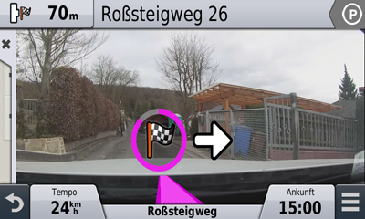 Dzięki funkcji Garmin Real Vision™ już nigdy nie przegapisz niezbyt czytelnego numeru domu. Gdy będziesz dojeżdżać do niektórych celów podróży, urządzenie nüviCam LMT-D przełączy się w widok kamery, a dokładny kierunek jazdy zostanie wskazany jasną, kolorową strzałką.