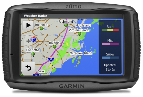 Co dzieje się na drodze? Urządzenie zūmo 590LM umożliwia dostęp do informacji o pogodzie i utrudnieniach drogowych w czasie rzeczywistym za pomocą aplikacji Smartphone Link4 (wymagana subskrypcja).