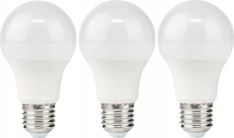 Nedis LBE27A603P3 Zestaw trzech żarówek LED o mocy 11 W na gniazda E27 to idealne rozwiązanie, które zapewnia znaczne oszczędności energii w porównaniu do tradycyjnej żarówki o mocy 80 W. Ich matowa obudowa równomiernie roztacza przyjemne światło. Specyfikacje: Gniazdo: E27, Pobór mocy: 11 W, Natężenie światła: 1055 lm, Kolor światła: ciepła biel, Temperatura barwowa: 2700 K, Żywotność: 15 000 godzin, Napięcie wejściowe: 220-240 V, Kąt wiązki światła: 200°, Klasa energetyczna (EEI): F