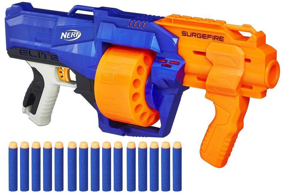 Nowa wyrzutnia Elite - SurgeFire stawia na szybkość i ilość! Posiadający magazynek bębenkowy jest w stanie pomieścić aż 15 strzałek Nerf Elite. Wybierz cel, przeładuj miotacz i ognia! Zasięg wystrzału wyrzutni to aż 27 metrów!