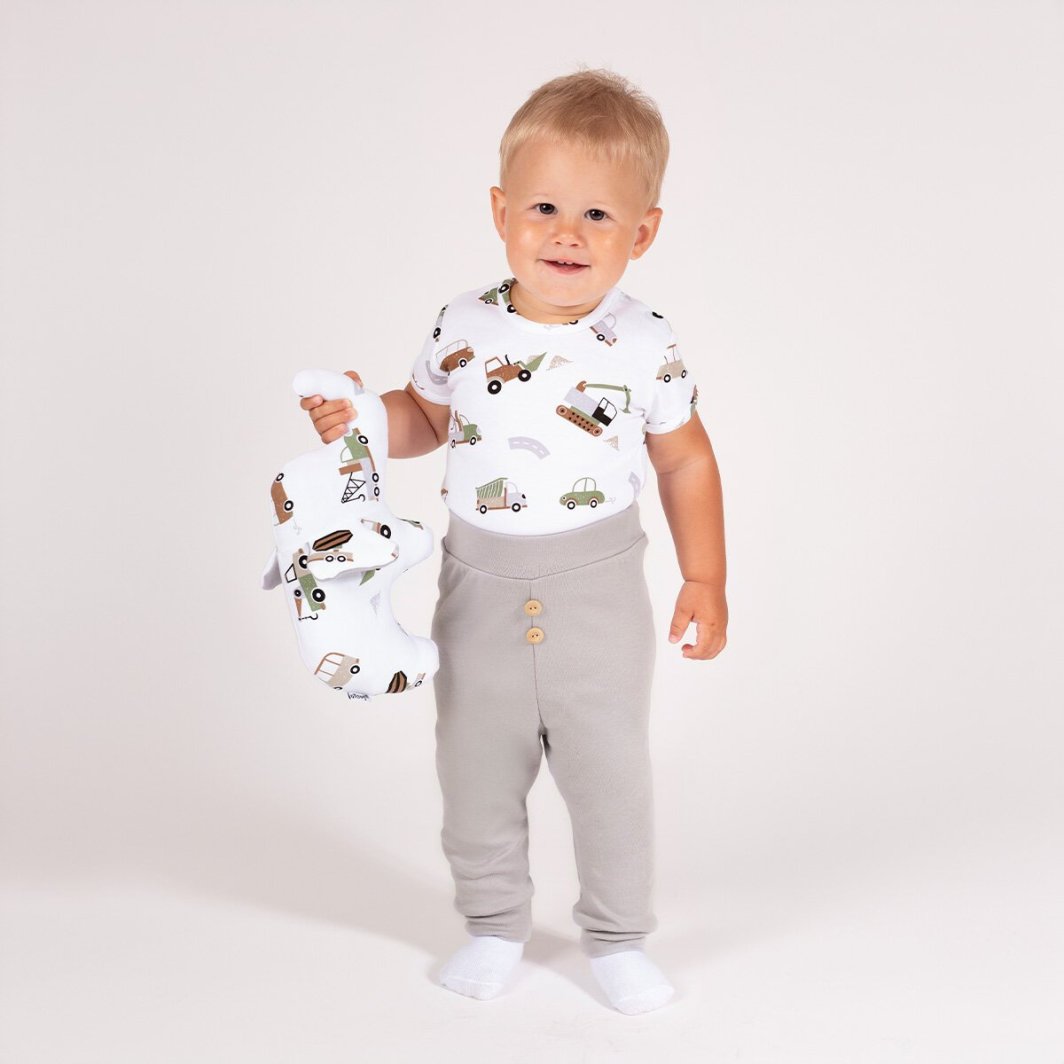 Stylowe spodnie dla młodego chłopca wykonane z bawełny w kolorze popielatym. Materiał jest w pełni bezpieczny dla delikatnej skóry dziecka. Pas i mankiety w nogawkach są wykończone tym samym materiałem. Spodnie posiadają gumkę w pasie od rozmiaru 68. Na przodzie spodni znajdują się dwie naszyte drewniane guziczki.