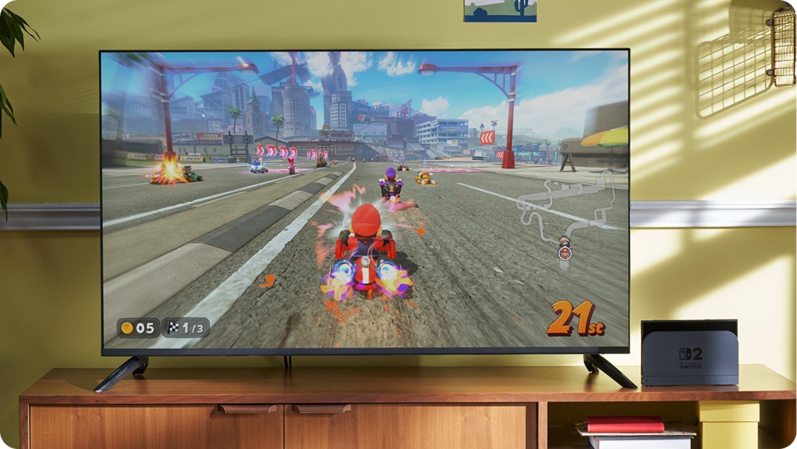 Podłącz Nintendo Switch 2 do kompatybilnego telewizora i odkryj gry w rozdzielczości do 4K. Dzięki wsparciu dla HDR, rozgrywka na dużym ekranie zachwyca bogatymi kolorami, lepszym kontrastem i wyraźniejszymi detalami.