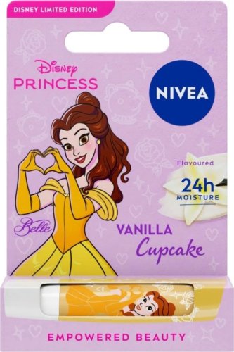 Odkryj pielęgnującą pomadkę do ust NIVEA Vanilla Cupcake Bella z Limitowanej Edycji Disney Princess, która zapewnia słodki aromat wanilii i subtelny połysk. Unikalna formuła zawierająca wyłącznie składniki pochodzenia naturalnego bez składników pochodzenia zwierzęcego, takich jak etycznie pozyskiwane masło shea, olejki i witaminy, wtapia się w usta i utrzymuje ich nawilżenie przez ponad 24 godziny. Chroni usta przed zimnem, wiatrem i suchym powietrzem. Równomiernie i łatwo się rozprowadza, dzięki czemu nie wymaga korzystania z lusterka! Dla pięknego dotyku błyszczącego koloru i miękkich, całuśnych ust - przez cały dzień, każdego dnia! Tolerancja dla skóry potwierdzona dermatologicznie - testowana klinicznie!