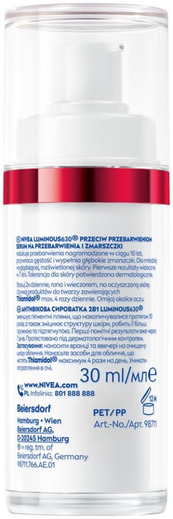 Odkryj moc NIVEA Luminous630* – serum do twarzy, które skutecznie łączy działanie przeciw przebarwieniom oraz przeciwzmarszczkowe. To innowacyjne serum oferuje podwójne działanie, redukując przebarwienia nagromadzone przez 10 lat oraz wzmacniając strukturę skóry. Już po 2 tygodniach stosowania dostrzeżesz pierwsze efekty, co czyni ten produkt idealnym rozwiązaniem dla osób pragnących poprawić wygląd swojej cery.