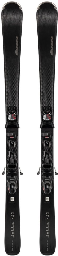 Narty Nordica BELLE zestawiono z wiązaniami Marker FDT10 z zakresem wartości skali siły wypięcia DIN 3 - 10. Wiązania montowane są na płycie szynowej z manualną regulacją rozstawu wiązań.