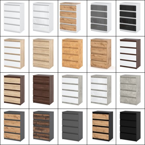 Komoda została wyposażona w cztery przestronne szuflady, które umożliwiają łatwe uporządkowanie i przechowywanie różnych przedmiotów, takich jak odzież, dokumenty czy drobiazgi. Bezuchwytowe otwieranie zapewnia wygodę użytkowania oraz podkreśla minimalistyczny charakter mebla. Dodatkowo, blokada wysuwu zapobiega przypadkowemu wypadnięciu szuflad, co zwiększa bezpieczeństwo użytkowania.