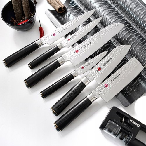 Rączka noża wykonana z materiału G10 zapewnia wygodny chwyt oraz elegancki wygląd. Dzięki ergonomicznemu kształtowi, nóż doskonale leży w dłoni, co pozwala na długotrwałe i komfortowe użytkowanie, nawet podczas intensywnego gotowania.