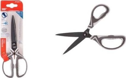 Nożyczki nieprzywierające z silikonową rączką z drobnymiwłóknami, które amortyzują i zapobiegają zakleszczaniusię rączki w palcach. Lekkie i ergonomiczne.Zaokrąglone końcówki zapobiegające przebiciom.Blachy stalowe. Rozmiar 190 mm. Blister1 sztuki.