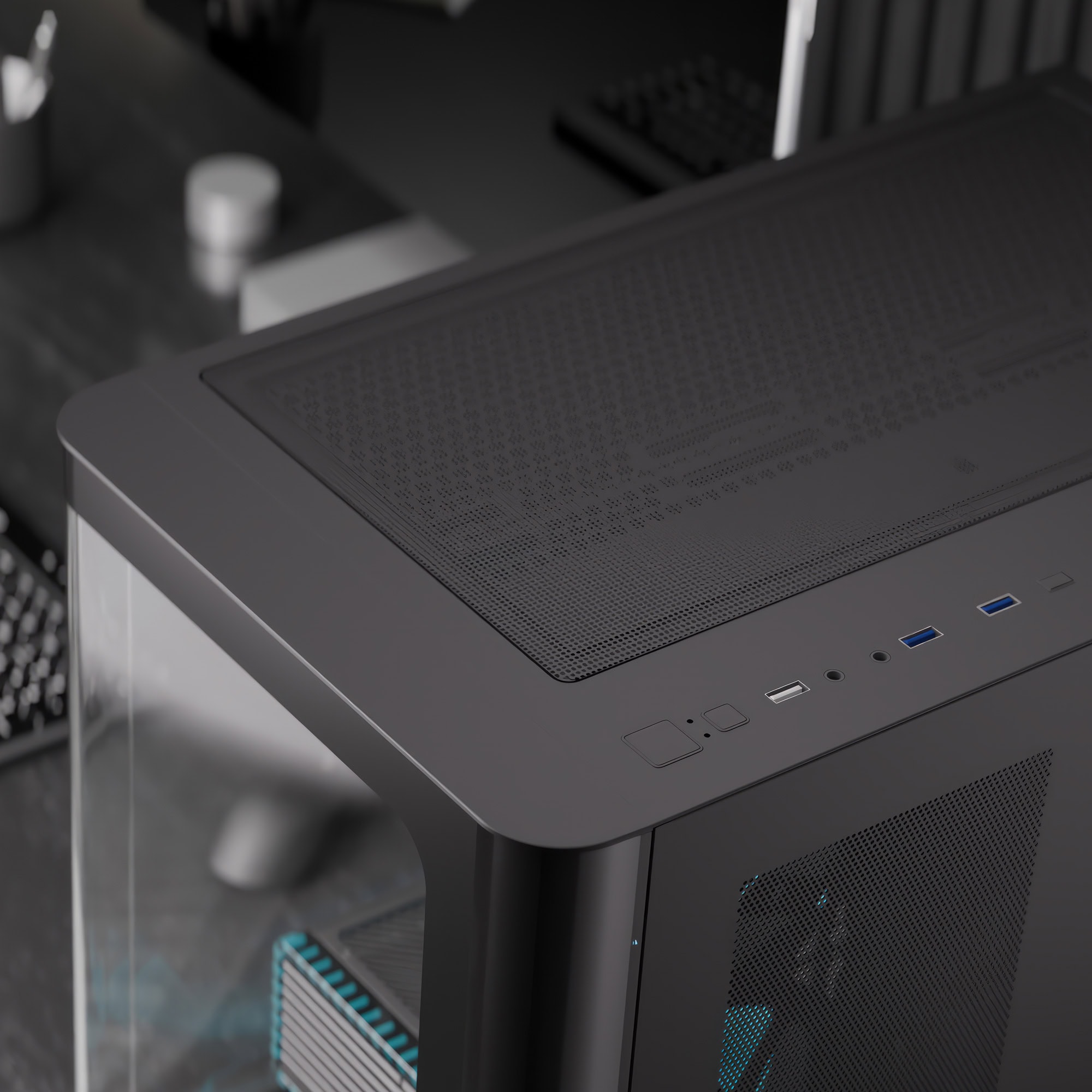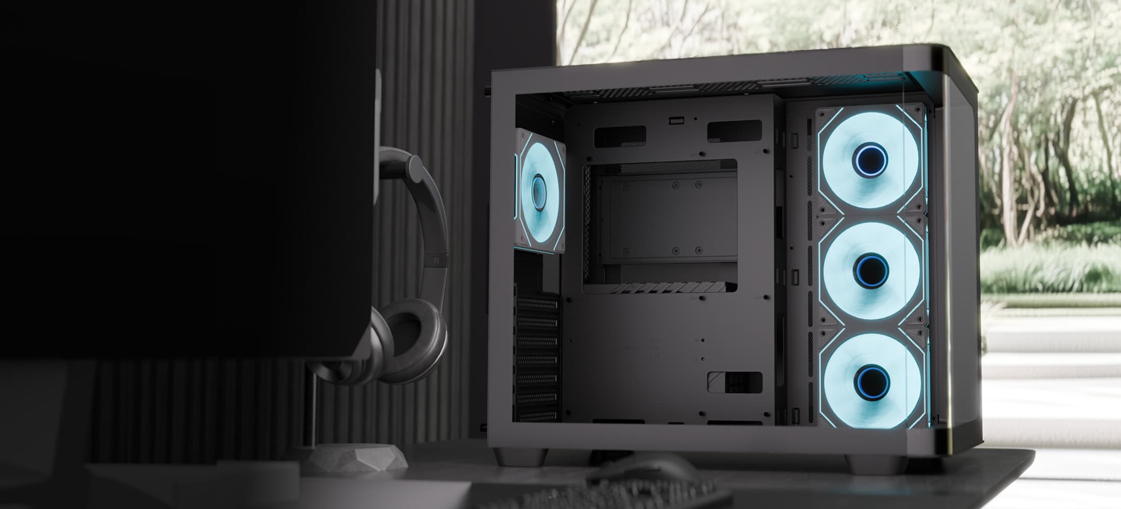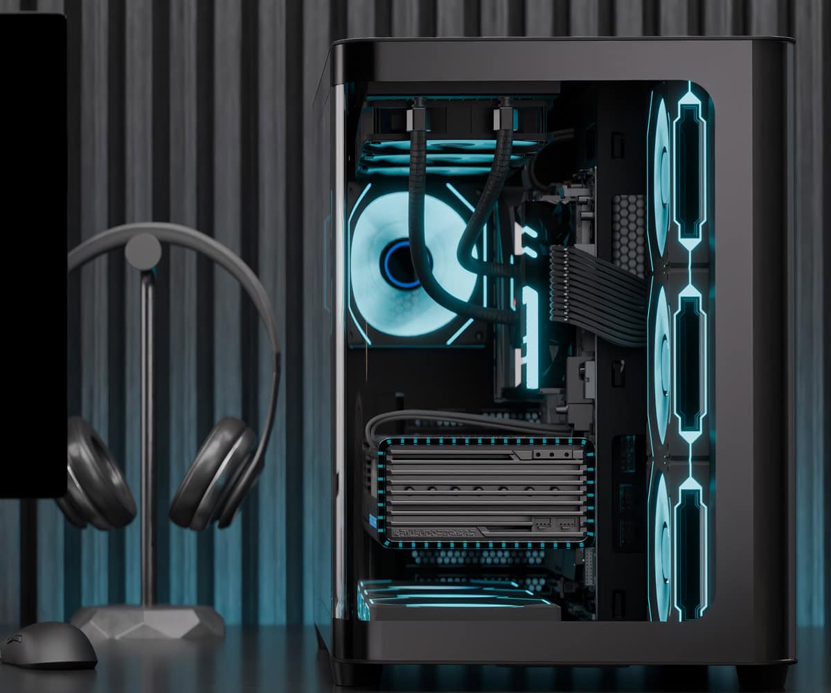 Zaprezentuj swój komputer w stylowy sposób dzięki zakrzywionym panelom przednim i bocznym ze szkła hartowanego, które zapewniają panoramiczny widok na wnętrze komputera.