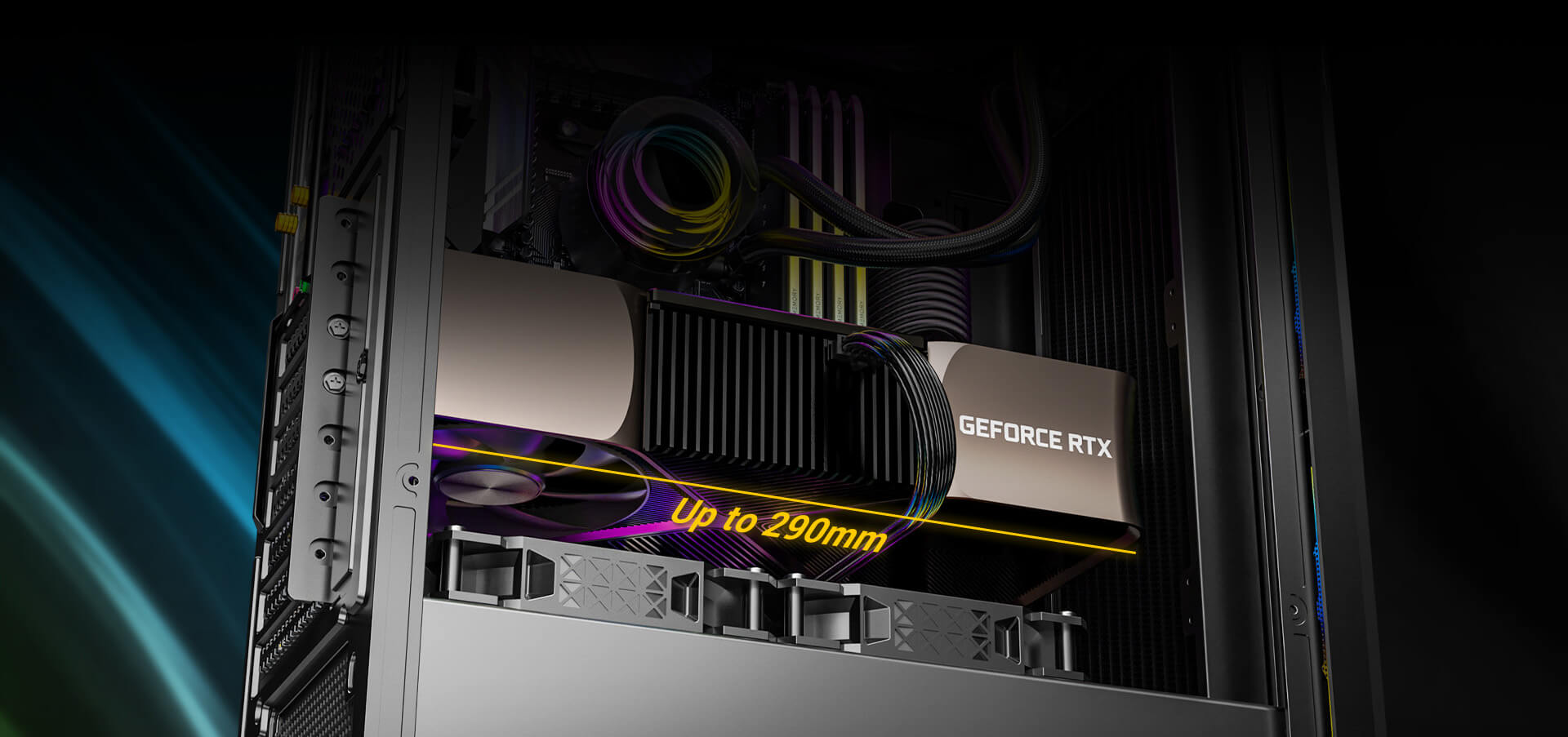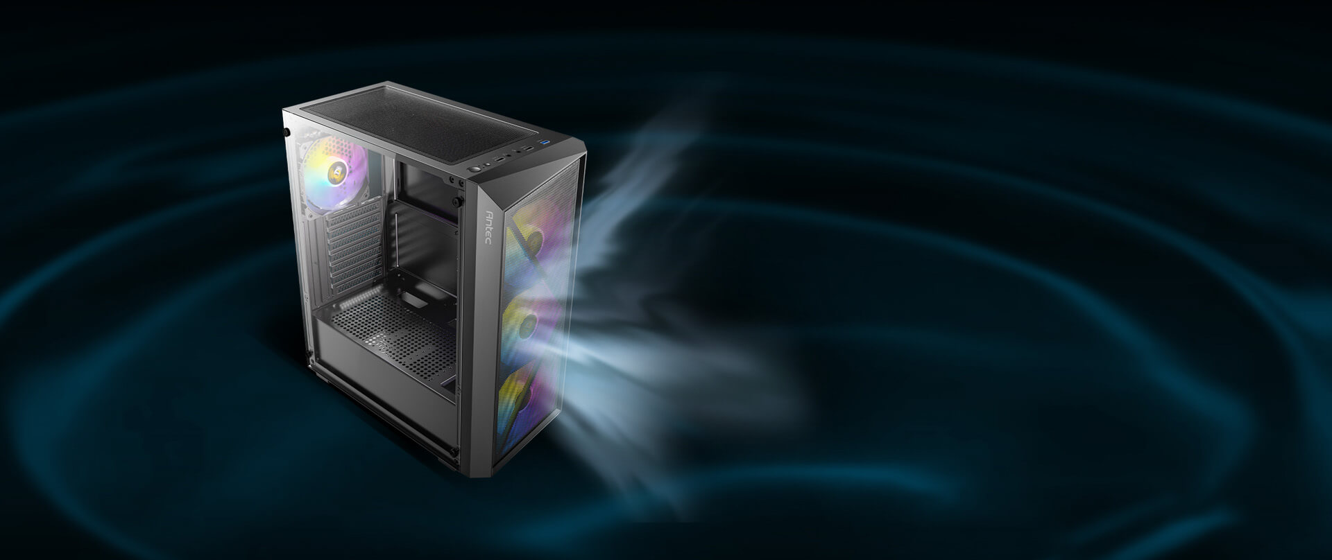 Wszechstronne kanały przepływu powietrza zapewniają wysoce wydajne chłodzenie. Wloty powietrza z przodu i na dole obudowy gwarantują doskonałe odprowadzanie ciepła. Zoptymalizowana ścieżka powietrza kieruje chłodny strumień na kartę graficzną i procesor, czyli tam, gdzie jest on najbardziej potrzebny. Ciepłe powietrze jest następnie sprawnie usuwane z obudowy przez górne i tylne otwory wentylacyjne. Taka konfiguracja zapobiega powstawaniu "martwych stref" z gorącym powietrzem, utrzymując stabilność systemu nawet podczas intensywnej rozgrywki.