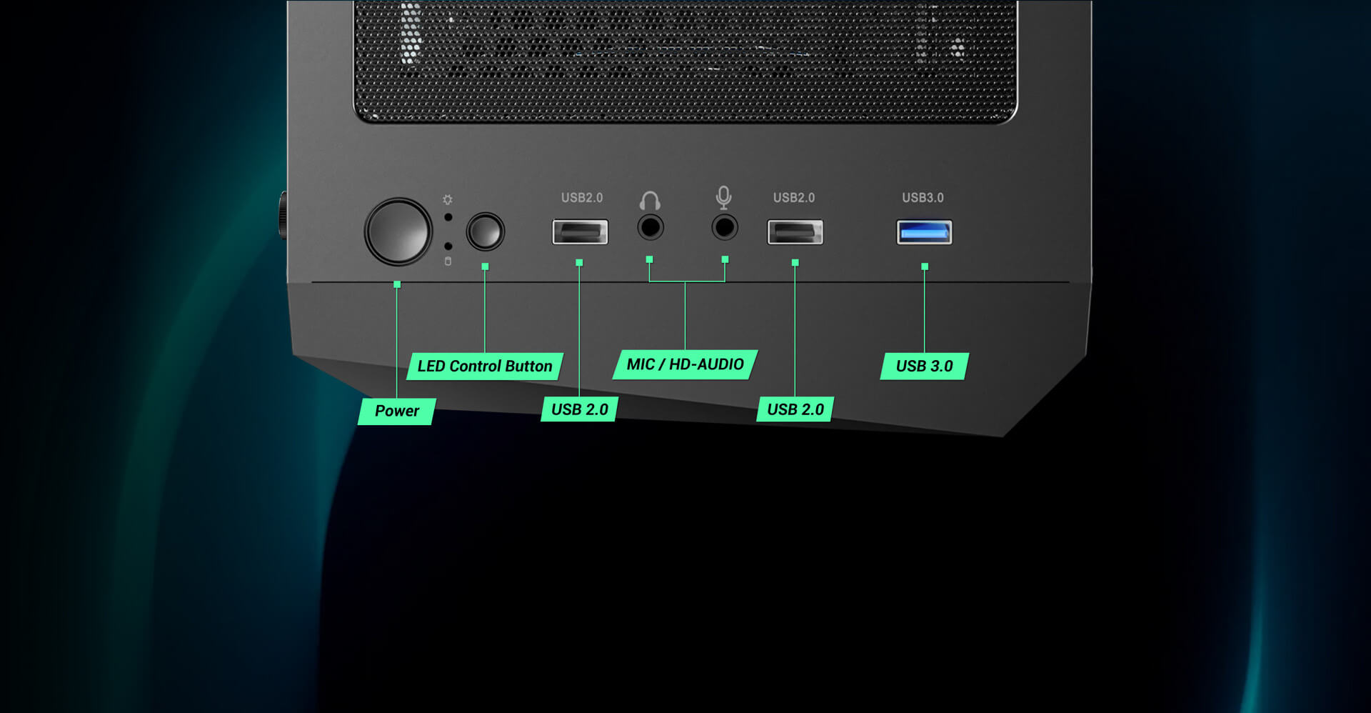 Przycisk Power, Przycisk Kontroli LED, 2 x USB 2.0, 1 x USB 3.0, HD-AUDIO. Wszystkie niezbędne złącza umieszczono w łatwo dostępnym miejscu na górze obudowy, co zapewnia maksymalną wygodę użytkowania. Szybki port USB 3.0 pozwala na błyskawiczny transfer danych, a dedykowany przycisk LED umożliwia natychmiastową zmianę trybów podświetlenia bez potrzeby używania oprogramowania. Dzięki temu podłączanie peryferiów, pendrive'ów czy słuchawek jest proste i intuicyjne.