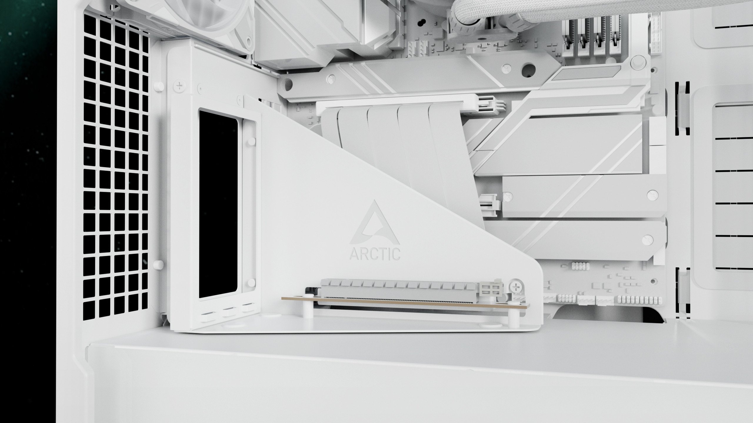 Dla entuzjastów ceniących sobie estetykę, Arctic Xtender oferuje możliwość pionowego montażu karty graficznej. Dzięki dołączonemu riserowi PCIe w wersjach VG, możesz wyeksponować swoją kartę graficzną w całej okazałości, czyniąc ją centralnym punktem Twojej konstrukcji. To nie tylko poprawia wizualny aspekt zestawu, ale także pozwala na lepsze zarządzanie przestrzenią i optymalizację przepływu powietrza wokół GPU. Obudowa umożliwia pionowy montaż karty graficznej za pomocą 160-milimetrowego kabla riser PCIe Gen 4.