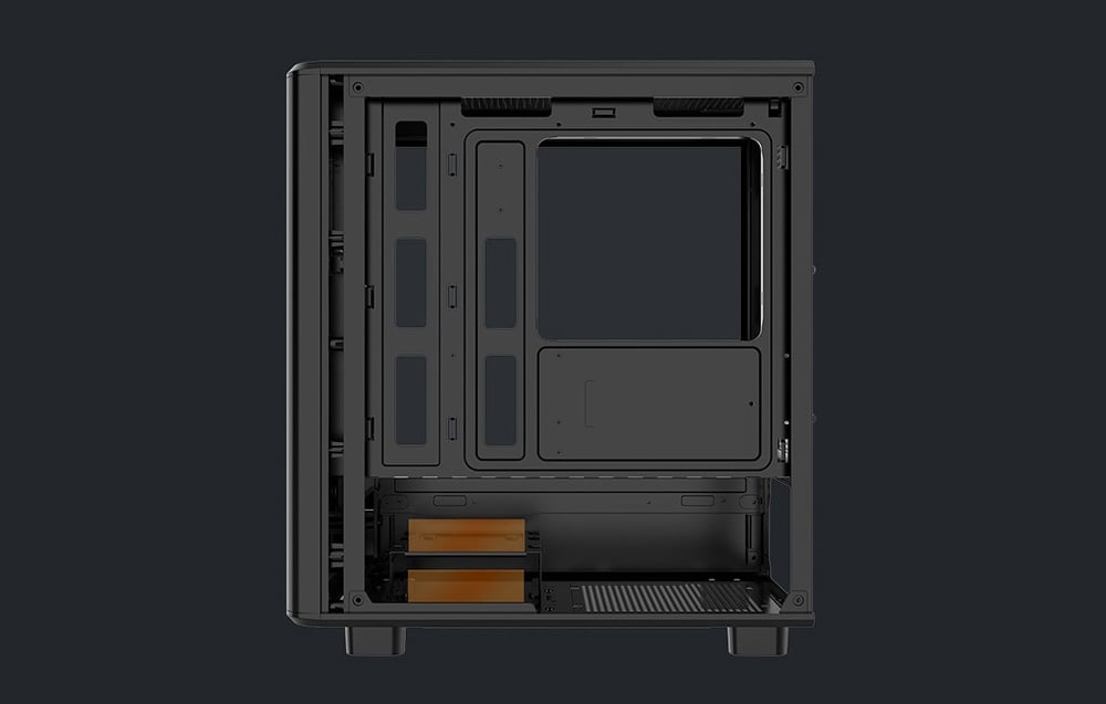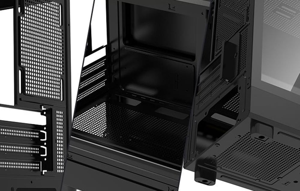 Lewy panel wykonany jest ze szkła hartowanego, co umożliwia wyeksponowanie wnętrza komputera i podzespołów z podświetleniem RGB. Panel można łatwo zdemontować bez użycia narzędzi.
