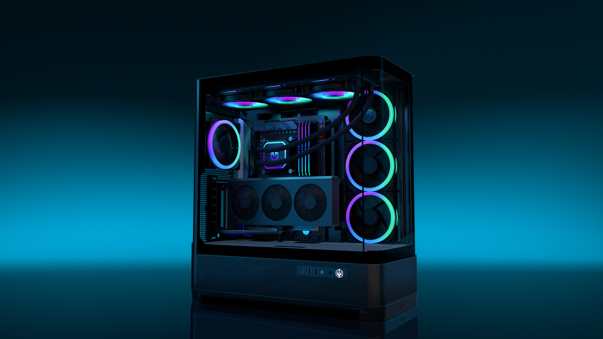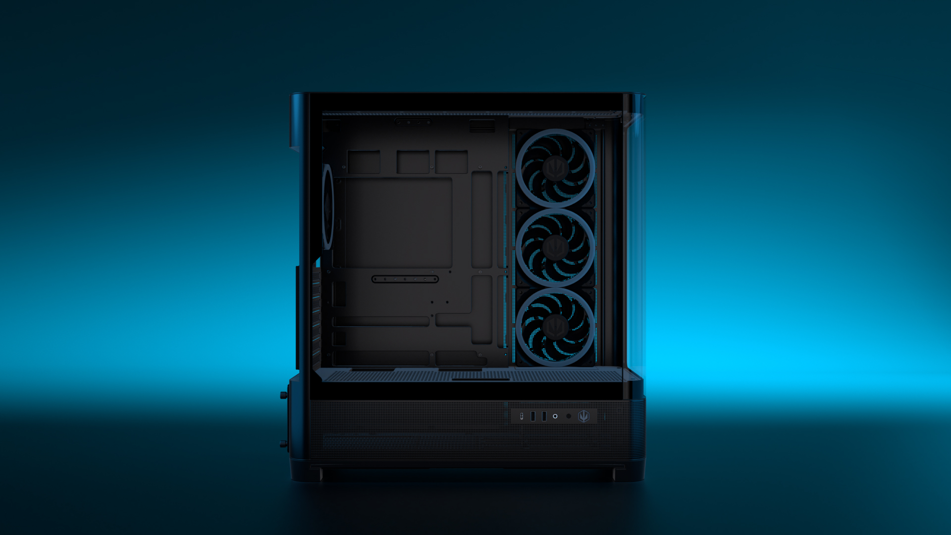 Aquarius 8000 Corona wyposażony jest w cztery preinstalowane wentylatory ENDORFY Corona 120– trzy w wersji Reverse na boku oraz jeden standardowy z tyłu. Dwustronny ring ARGB zapewnia efektowne podświetlenie widoczne z każdej strony, a zakres pracy 200–1600 RPM z precyzyjnym sterowaniem PWM i łożysko FDB gwarantują wysoką kulturę pracy (szczególnie w trybie półpasywnym), trwałość i dobry przepływ powietrza.
