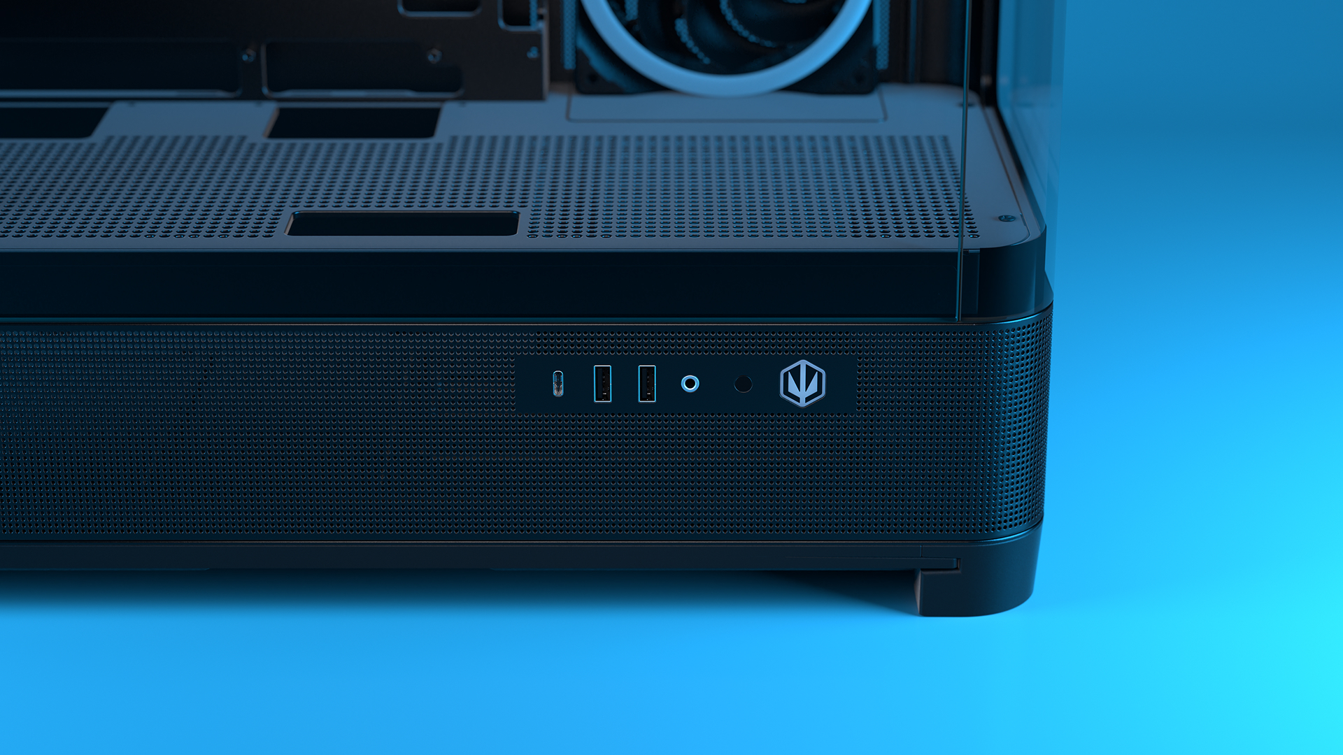 W konstrukcjach typu „akwarium” dostęp do portów jest zazwyczaj co najmniej nieporęczny– a w najgorszym wypadku całkowicie poza zasięgiem. W obudowie Aquarius 8000 Corona panel złącz umieściliśmy na dole bocznej ścianki, dzięki czemu pozostaje zawsze pod ręką po postawieniu komputera na biurku, bez względu na orientację obudowy. Do dyspozycji jest szybkie USB-C 3.2 Gen 2 (do 10 Gbps), dwa porty USB-A 3.2 Gen 1 (do 5 Gbps) oraz złącze audio combo minijack na słuchawki i mikrofon, co pozwala wygodnie podłączać najważniejsze akcesoria.