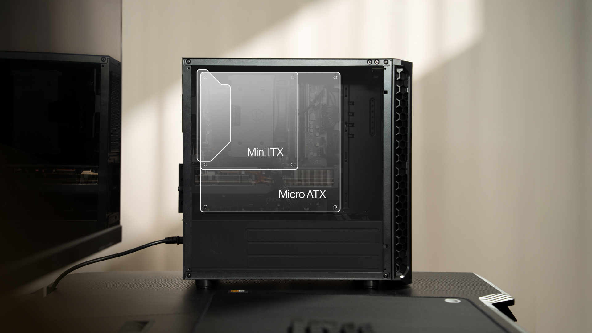 Boczny panel z hartowanego szkła nadający nowoczesny wygląd obudowie pozwala wyeksponować podzespoły komputera. Przestrzeń za tacką płyty głównej oraz odpowiednio rozmieszczone przepusty i punkty montażowe na opaski zaciskowe umożliwiają schludne poprowadzenie oraz ukrycie kabli. Odpowiednie ułożenie przewodów ułatwia utrzymanie porządku wewnątrz obudowy, poprawia estetykę zestawu i sprzyja lepszemu przepływowi powietrza.