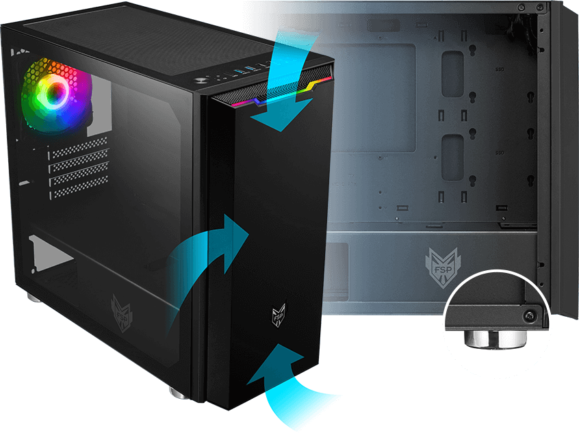Wyposażony w błyszczący, przedni panel ze stali siatkowej i pasek świetlny ARGB, obudowa CST310 zapewni wyrafinowany wygląd Twojego systemu. Konstrukcja CST310 jest bardziej trwała i odporniejsza na obciążenia od innych obudów micro ATX dzięki 7 mm stalowej konstrukcji.