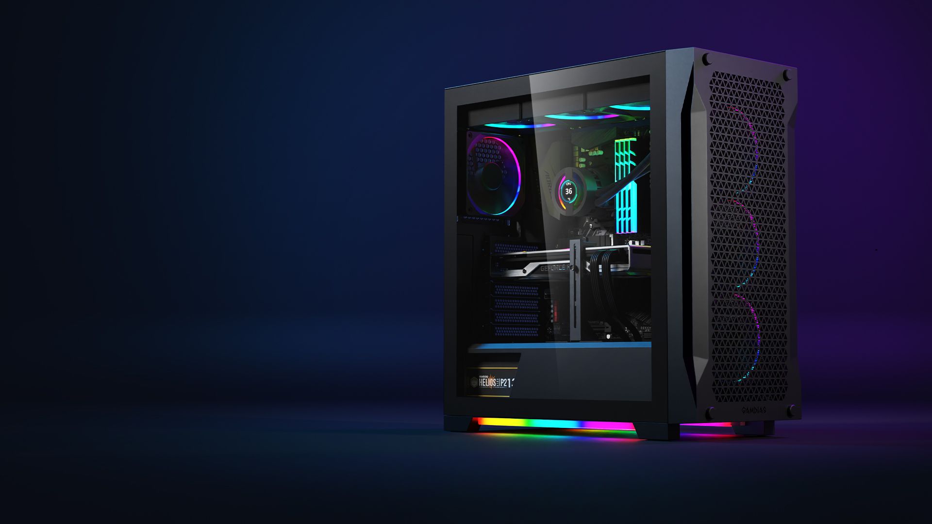 ATHENA P1 obsługuje ogólnosystemową technologię ARGB na kompatybilnych płytach głównych z synchronizacją oświetlenia, która steruje 4 wbudowanymi wentylatorami ARGB i 2 paskami świetlnymi ARGB za jednym naciśnięciem przycisku.
