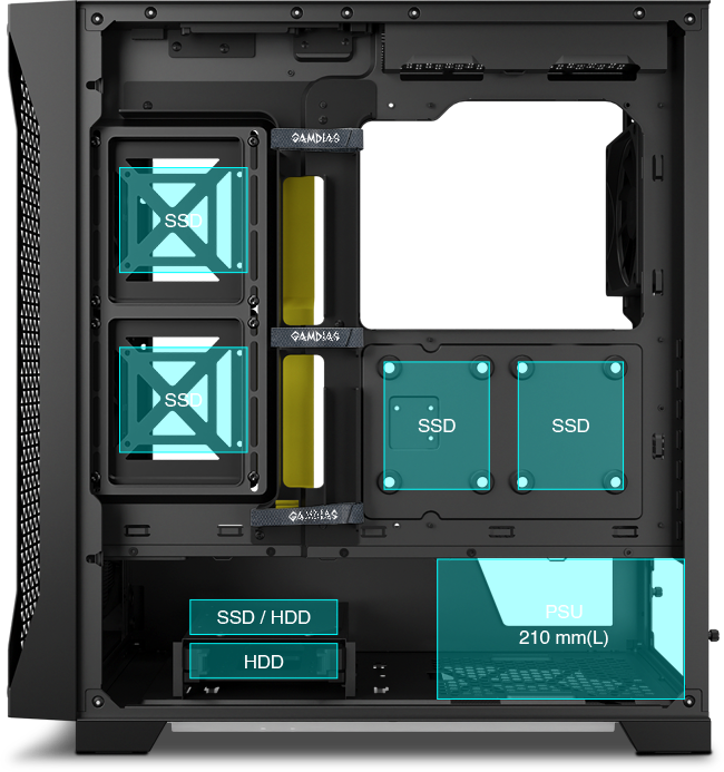 Dzięki dodatkowemu wspornikowi SSD obudowa umożliwia instalację do 5 dysków 2,5 cala lub 2 x 3,5 cala +2 x 2,5 cala lub 3 dysków 2,5 cala +1 x 3,5 cala i mieści zasilacze o długości do 210 mm.
