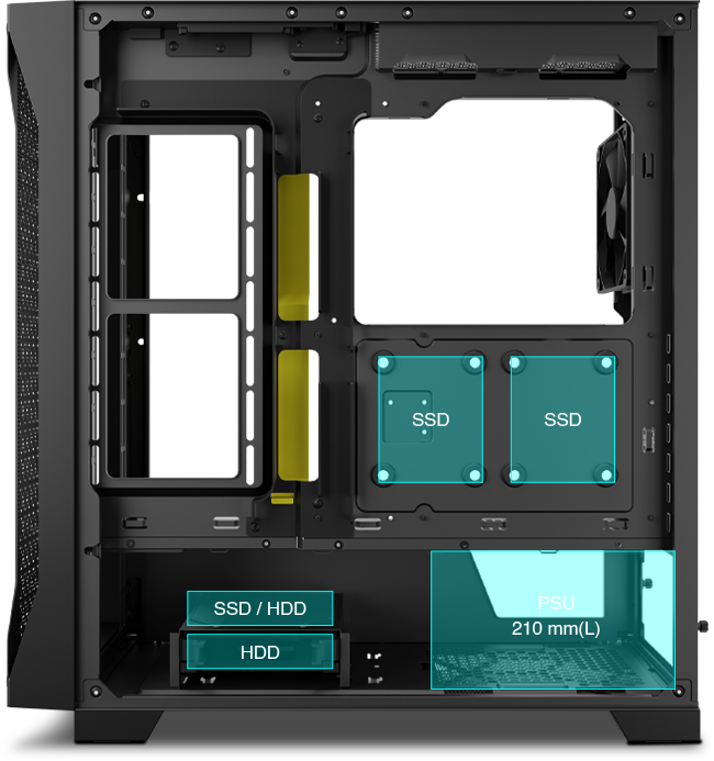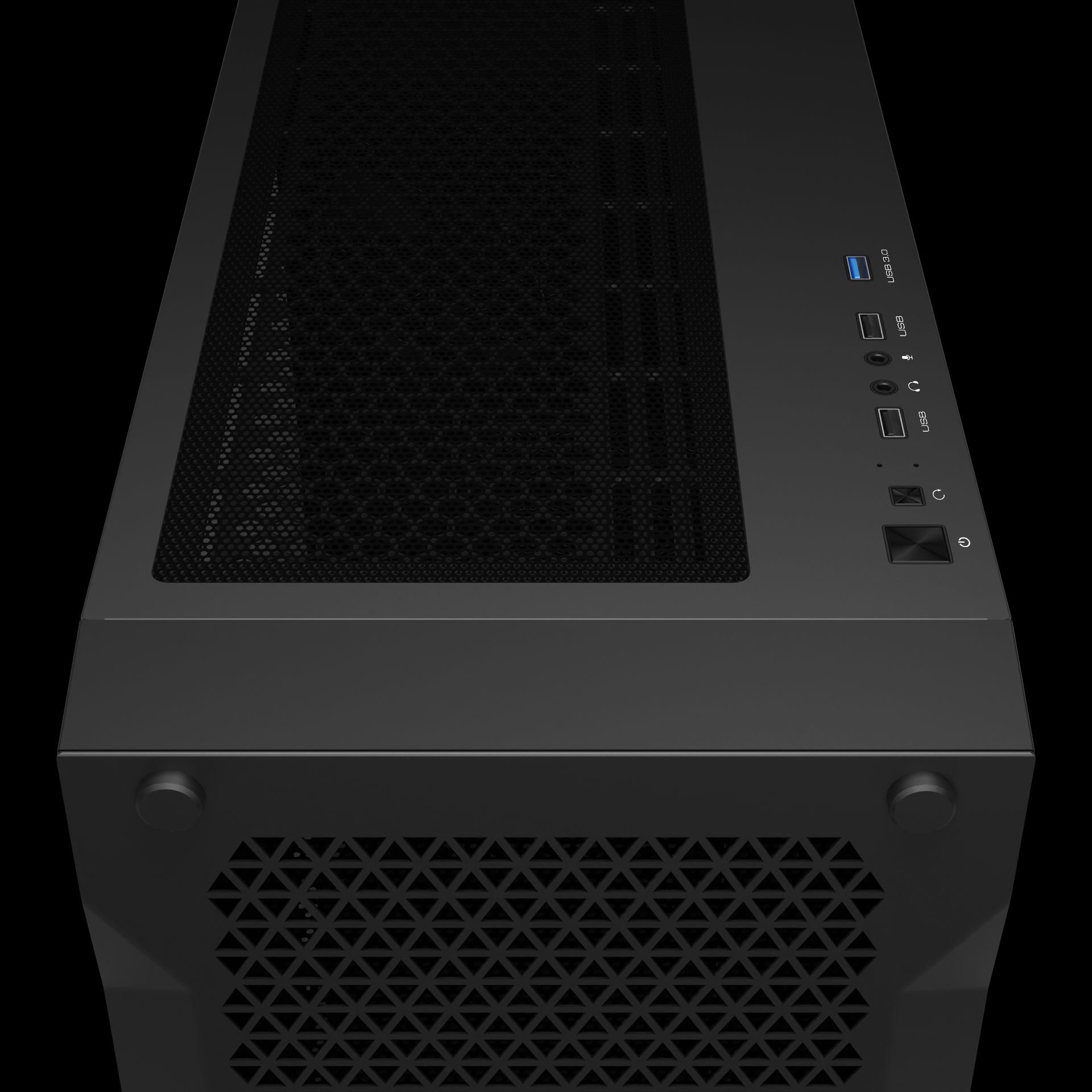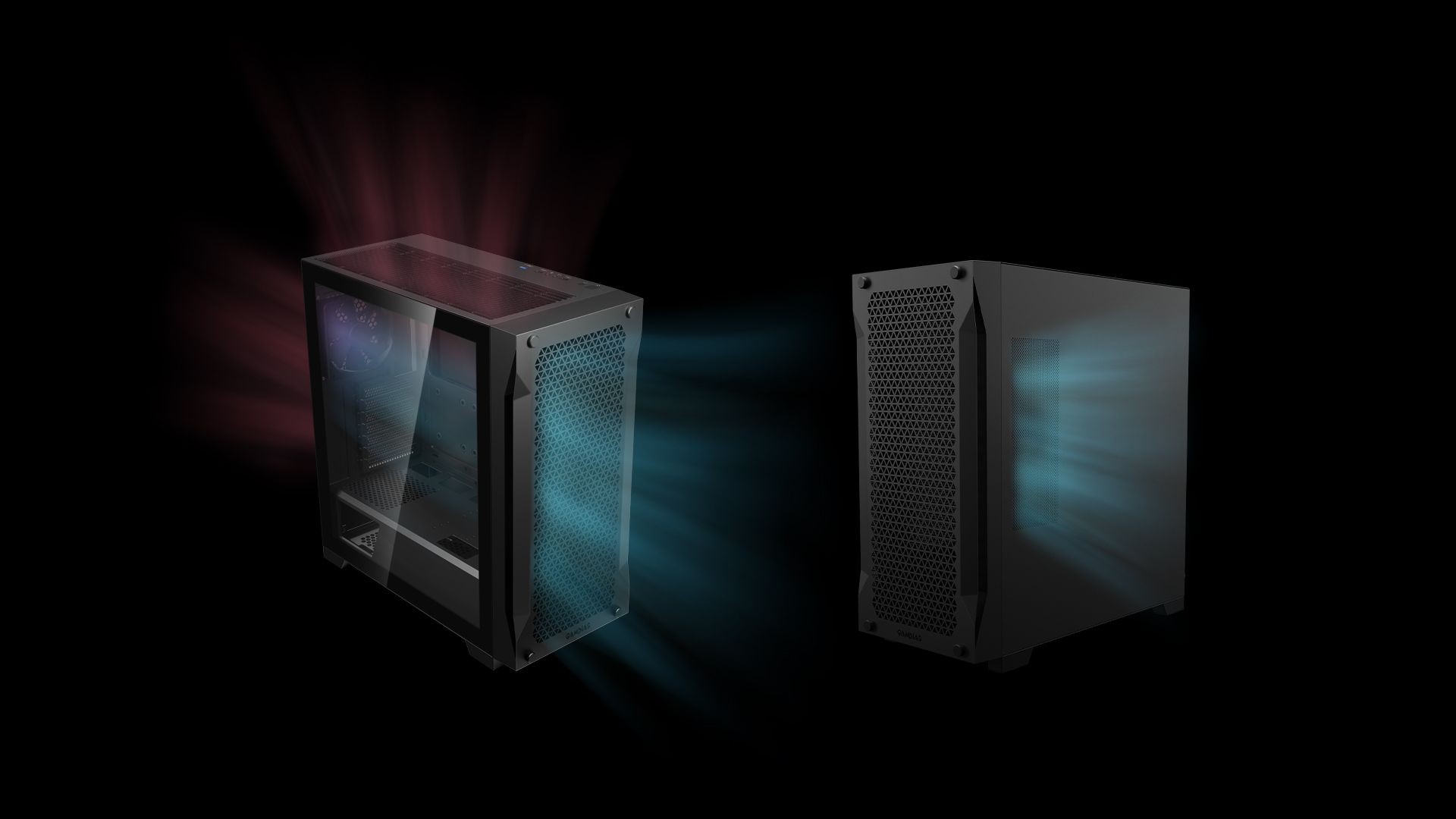 Obudowa koncentruje się na konfiguracji o wysokim przepływie powietrza, aby zapewnić najlepsze możliwe chłodzenie, z matowym czarnym perforowanym panelem przednim z siatki oraz dodatkowymi otworami wlotowymi i wylotowymi, co zapewnia doskonałą wydajność i estetykę. Wnętrze obsługuje najnowszy procesor graficzny i jest wyposażone w zoptymalizowany system prowadzenia kabli, dzięki czemu budowa komputera PC jest łatwiejsza niż kiedykolwiek.
