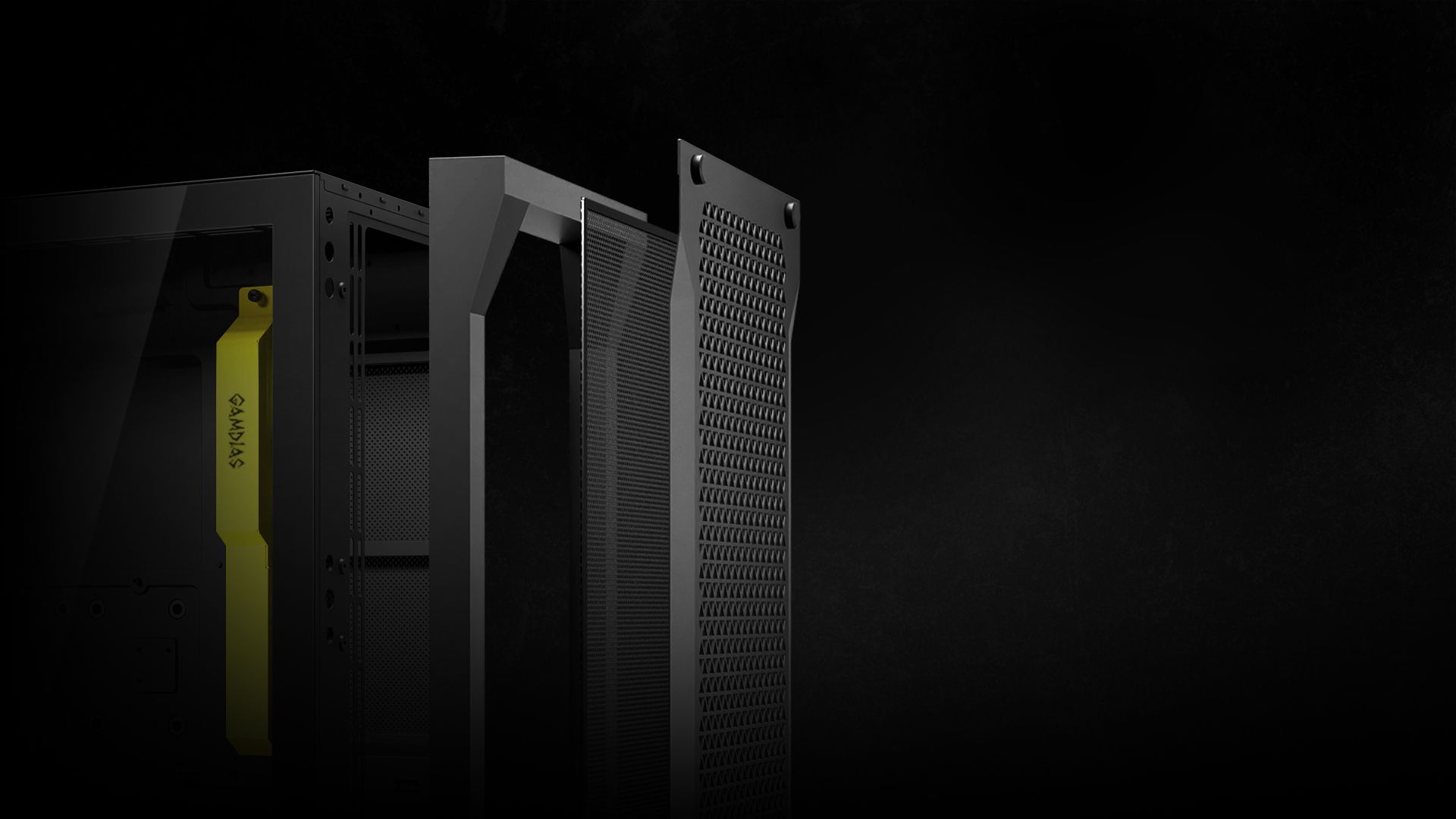 ATHENA P1 LITE umożliwia wysoce konfigurowalne konfiguracje wlotu i wylotu powietrza dzięki perforowanemu panelowi przedniemu i siatkowym otworom wentylacyjnym wbudowanym w całą obudowę.