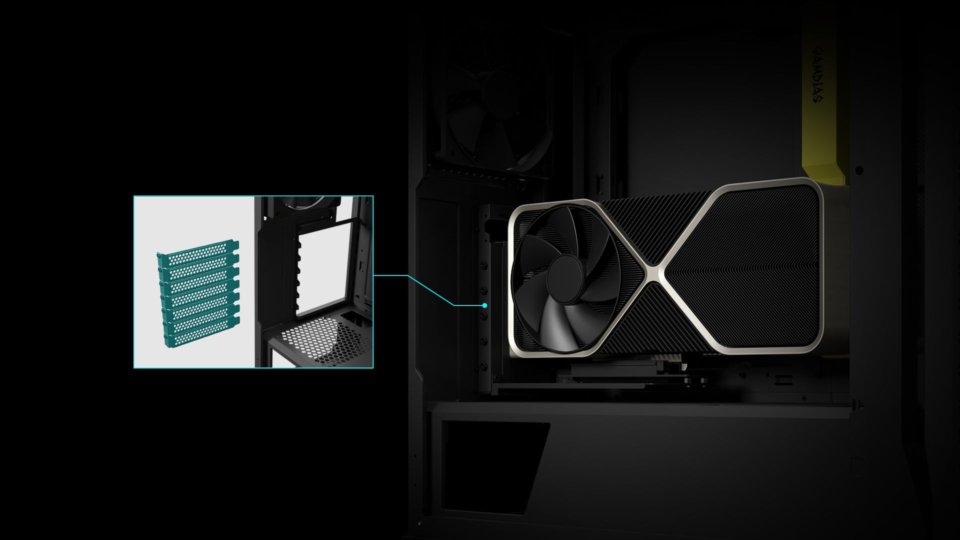 7 gniazd PCI-e wielokrotnego użytku o długości 405 mm oferuje elastyczne opcje obsługi kart graficznych z serii RTX 40 i wysokiej klasy komponentów komputerów PC. Po prostu zastąp wstępnie ustawione gniazda dodatkowym zestawem montażowym GPU i kablem PCI-e, aby zamontować kartę graficzną w pionie.