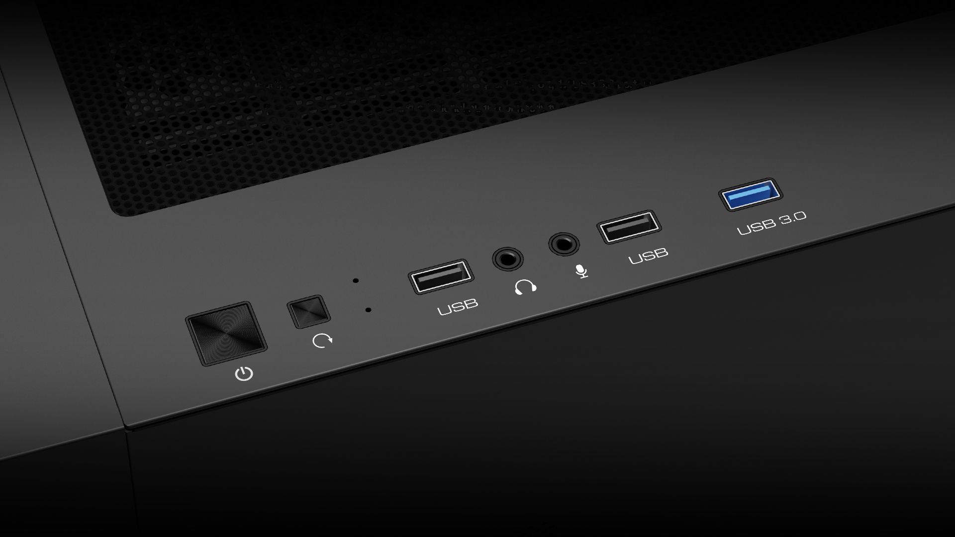 We/wy znajdują się w górnej części przedniej części obudowy i obejmują 2 porty USB, 1 port USB 3.0, sterowanie oświetleniem LED i dodatkową łączność audio.