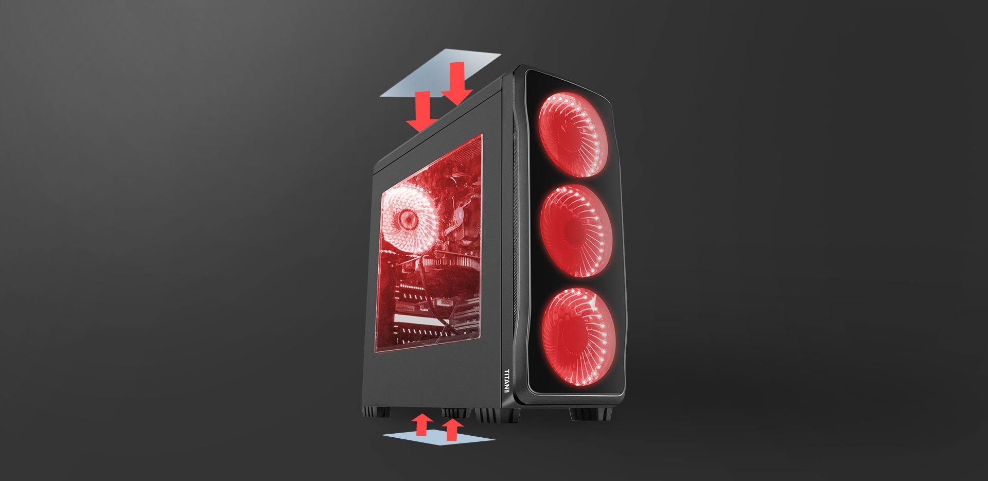 Zamiast zmuszać graczy do składania komputera od podstaw, umieściliśmy w Titan 750 cztery wysokiej jakości wentylatory – trzy na przodzie i jeden z tyłu. Jakby tego było mało, wszystkie cztery wentylatory mogą się pochwalić podświetleniem LED, generowanym przez 33 diody w każdym z nich. Co więcej, użytkownicy mogą wybrać między jednym z trzech modeli Titan 750, którego wentylatory występują w różnych wariantach kolorystycznych: czerwonym i niebieskim. Dodatkowo, Titan 750 posiada dwa filtry przeciwkurzowe - na górze i na dole obudowy.