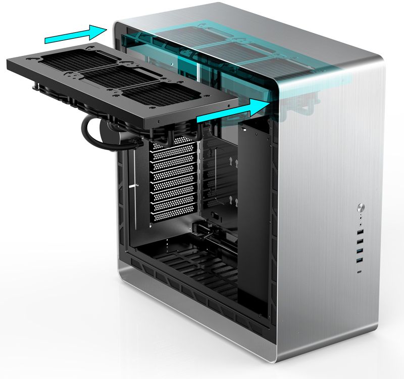 W pokrywie można zainstalować trzy wentylatory 120 lub dwa 140 mm w celu chłodzenia. Na dole obudowy jest miejsce na dwa dodatkowe wentylatory 120 mm, w tylnej ścianie można również zamontować wentylator 120 mm. Całkowita wysokość 169 mm jest dostępna dla dużych chłodzeń powietrzem procesora. Wolisz chłodzenie wodą? W pokrywie można zamontować radiator o średnicy do 360 mm, a w tylnej ścianie radiator 120 mm. Wyjmowany filtr przeciwpyłowy chroni wnętrze przed kurzem i brudem.