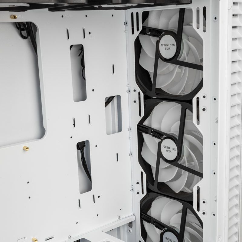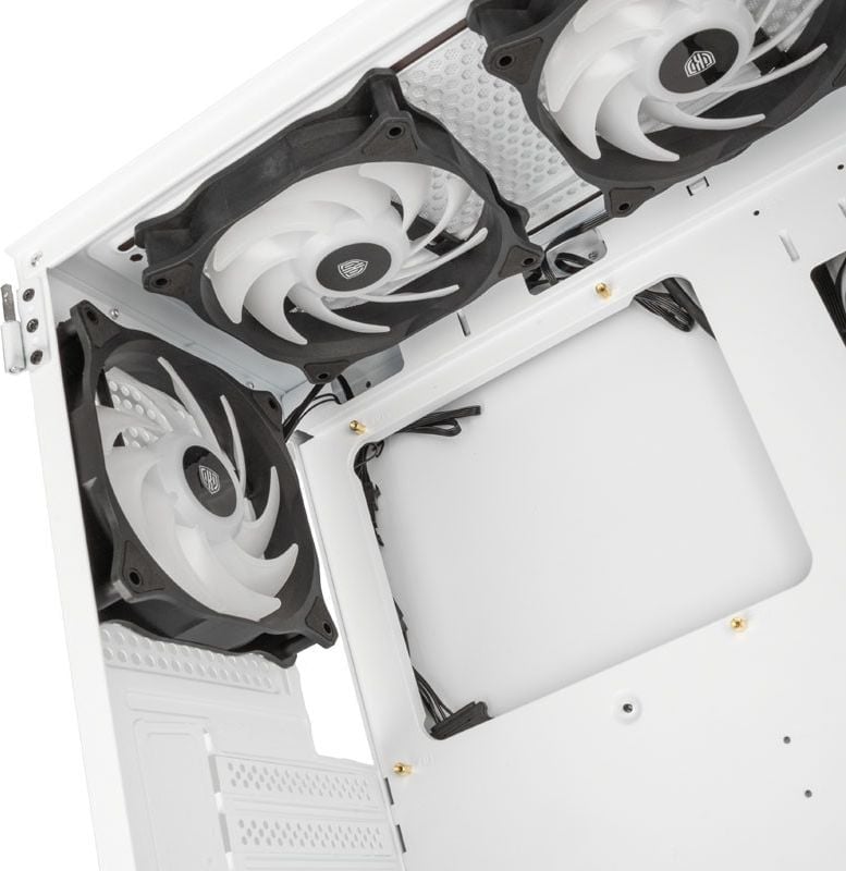 Alternatywnie z przodu można zainstalować maksymalnie trzy wentylatory 120 mm, a do pokrywy można przymocować dwa wentylatory 140 mm. Dodatkowo na pokrywie zasilacza znajdują się sloty na dwa wentylatory 120mm, umożliwiające bezpośrednie chłodzenie komory zasilacza oraz karty graficznej.