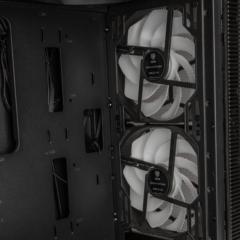Aby utrzymać optymalną temperaturę komputera do gier, Kolink Observatory MX Mesh może obsługiwać zarówno sprzęt chłodzony powietrzem, jak i wodą. W obudowie zamontowano pięć wentylatorów Kolink Umbra ARGB, które wspomagają przepływ powietrza przez panele siatkowe. Z przodu znajdują się dwa wentylatory 140 mm. Na górze znajdują się dwa modele 120 mm, a z tyłu znajduje się również pojedynczy wentylator 120 mm.