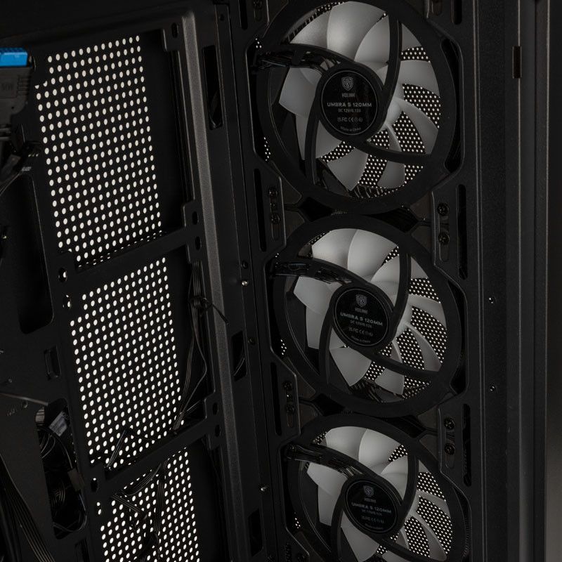Fabrycznie zainstalowane wentylatory w obudowie komputera Kolink Unity Meshbay ARGB to wentylatory Kolink Umbra S 120 mm PWM ARGB. Trzy z nich zamontowano z przodu, a czwarty z tyłu. Opcjonalnie z przodu mieszczą się także trzy wentylatory 140 mm. Ten sam numer mieści się na wieczku. Można także zamontować trzy wentylatory 120 mm na prawej ścianie bocznej.