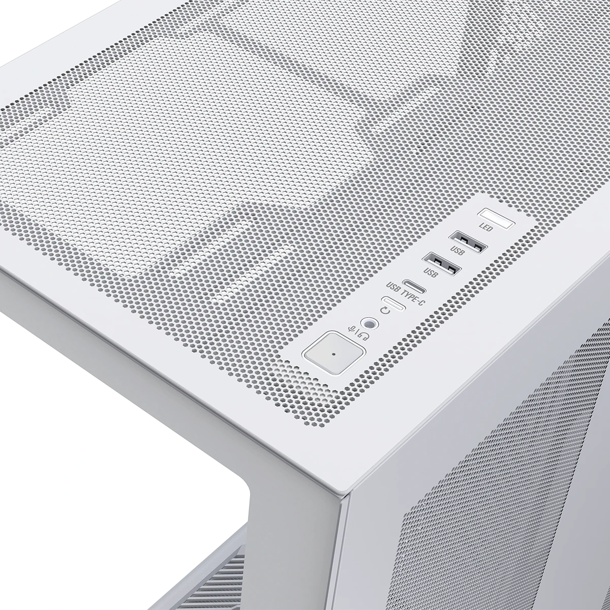 Na górnym panelu MODECOM Volcano Space XL Full Tower znajdziesz wygodne i szybkie złącza do podłączania urządzeń zewnętrznych. Dostępne są dwa porty USB 3.0 oraz jedno USB-C (USB 3.2 Gen 2), zapewniające łatwy dostęp do pamięci przenośnych, kontrolerów czy smartfonów. W gnieździe typu combo podłączysz zarówno mikrofon, jak i słuchawki, a przycisk do zmiany podświetlenia LED wentylatorów pozwala szybko dostosować wygląd wnętrza obudowy do swojego stylu. Nie brakuje tu także oddzielnego przycisku Reset. Dzięki temu panel I/O jest zarówno funkcjonalny, jak i intuicyjny – wszystko, czego potrzebujesz, masz zawsze pod ręką.