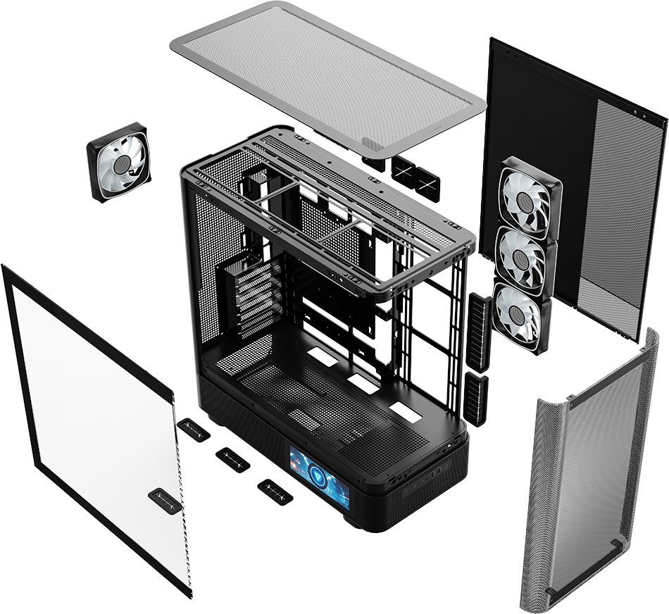 Wbudowany ekran LCD na boku obudowy umożliwia personalizację swojego stanowiska. Wyświetl animacje, film, zdjęcia i monitoruj pracę podzespołów. Po prostu przemów swoim obrazem. MODECOM Volcano AQ400 ARGB MIDI jest przedstawicielem serii obudów Volcano AQ charakteryzujących się efektownym wzornictwem obłych kształtów frontowego, (w tym przypadku perforowanego, metalowego panelu), możliwością montażu płyt głównych z odwróconymi złączami, czterema wentylatorami 120 mm ARGB w standardzie z kontrolerem podświetlenia ARGB i wsparciem dla chłodnic wodnych do 420 mm oraz licznymi perforacjami na panelach bocznych w celu zapewnienia chłodnej pracy komputera. Cechą charakterystyczną wersji AQ400 jest ekran LCD z boku obudowy na którym można wyświetlić zdjęcie, film w formacie mp4 lub monitorować temperaturę i obciążenie pracy procesora, karty graficznej czy użycie pamięci RAM. Całość zalet uzupełniają dwa porty USB 3.0 oraz jeden USB-C (USB 3.2 Gen 2). To obudowa stworzona, by cieszyć się widokiem podzespołów i spersonalizować komputer pod siebie.