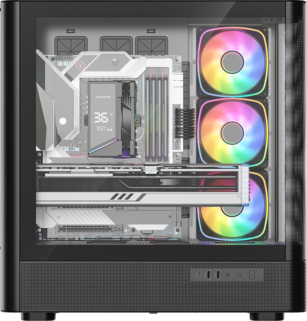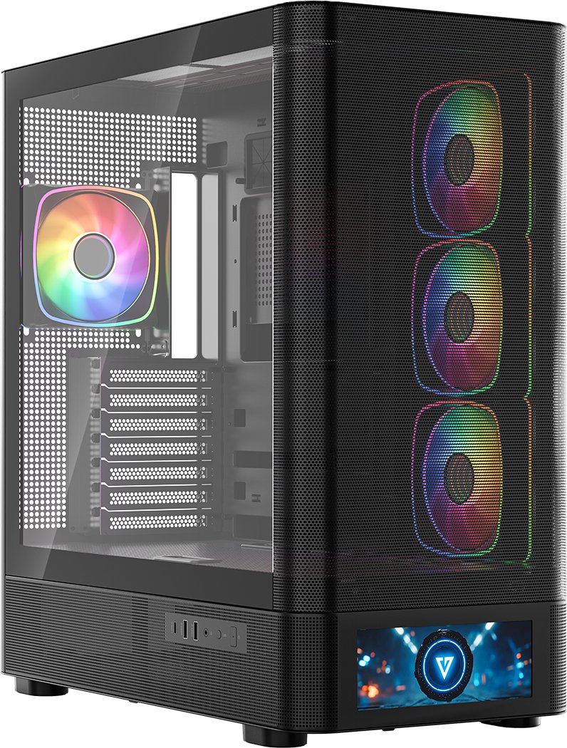 MODECOM Volcano AQ500 ARGB MIDI jest przedstawicielem serii obudów Volcano AQ charakteryzujących się efektownym wzornictwem obłych kształtów frontowego, (w tym przypadku perforowanego, metalowego panelu), możliwością montażu płyt głównych z odwróconymi złączami, czterema wentylatorami 120 mm ARGB w standardzie z kontrolerem podświetlenia ARGB i wsparciem dla chłodnic wodnych do 420 mm oraz licznymi perforacjami na panelach bocznych w celu zapewnienia chłodnej pracy komputera. Cechą charakterystyczną wersji AQ500 jest ekran LCD wbudowany na froncie obudowy, na którym można wyświetlić zdjęcie, film w formacie mp4 lub monitorować temperaturę i obciążenie pracy procesora, karty graficznej czy użycie pamięci RAM. Całość zalet uzupełniają dwa porty USB 3.0 oraz jeden USB-C (USB 3.2 Gen 2). To obudowa stworzona, by cieszyć się widokiem podzespołów i spersonalizować komputer pod siebie.