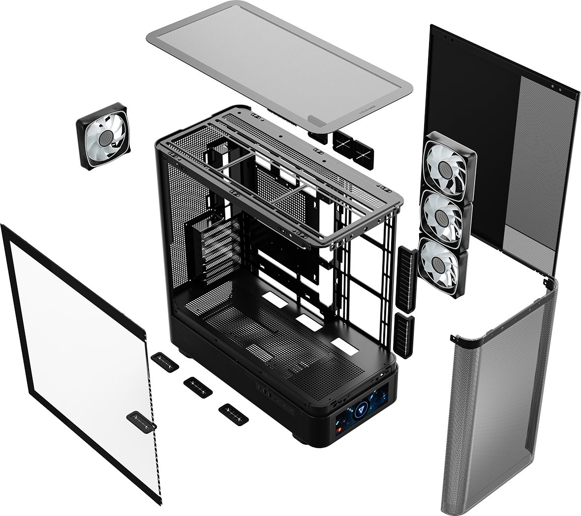 W obudowie MODECOM Volcano AQ500 ARGB MIDI zastosowaliśmy praktyczne i wygodne rozwiązania montażowe paneli bocznych oraz panelu górnego na zatrzaski kulkowe, aby w prosty, wygodny i bezpieczny sposób można było złożyć lub wyczyścić komputer. Wygodny demontaż górnego panelu ułatwia konserwację komputera. Możesz go zdjąć jednym ruchem, co pozwala na szybkie i skuteczne pozbycie się kurzu.