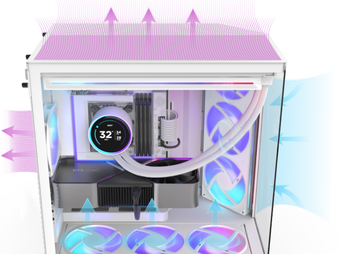 Obudowa H9 Flow to nie tylko wydajność, ale także wygoda użytkowania. Jej konstrukcja ułatwia montaż komponentów, a specjalne przepusty do zarządzania kablami pozwalają na utrzymanie porządku wewnątrz. Elegancki i minimalistyczny design, z dyskretnym logo NZXT, sprawia, że obudowa doskonale wkomponuje się w każde nowoczesne wnętrze.