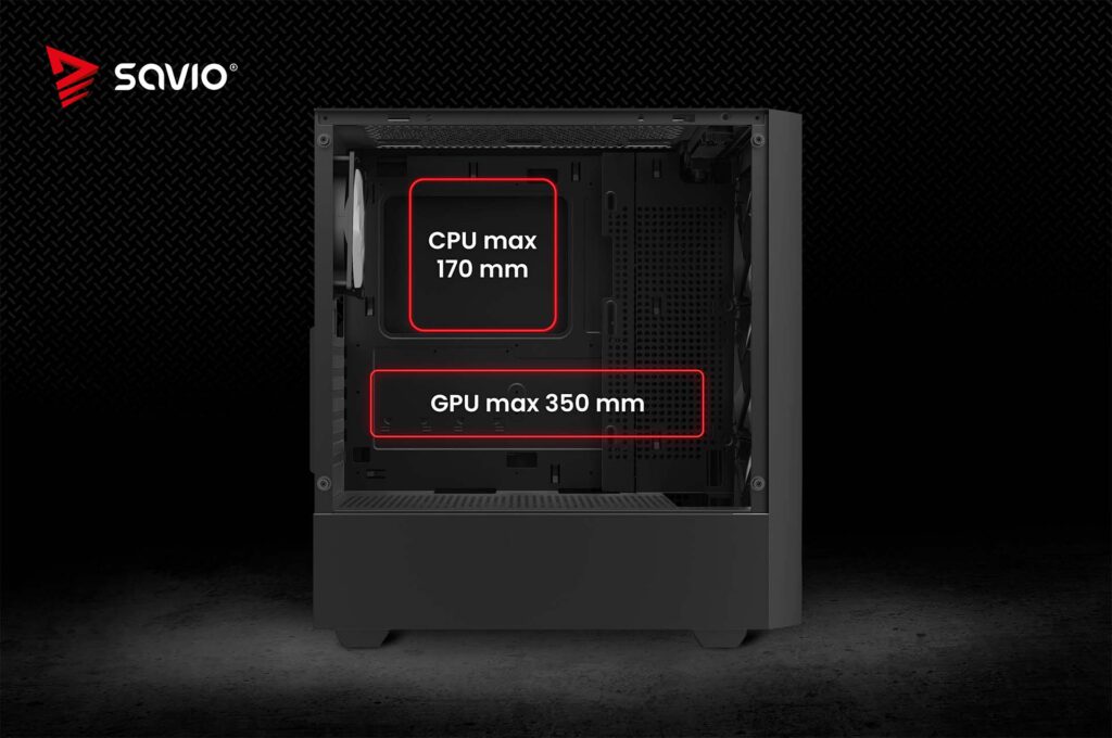 Obudowa obsługuje chłodzenie procesora do 170 mm, karty graficzne do 350 mm i zasilacze do 180 mm (lub 230 mm po wyjęciu klatki na dysk twardy). Oznacza to, że możesz wybrać dokładnie taki układ graficzny i system chłodzenia, który zapewni najwyższą wydajność — bez obaw, że wszystko się zmieści.