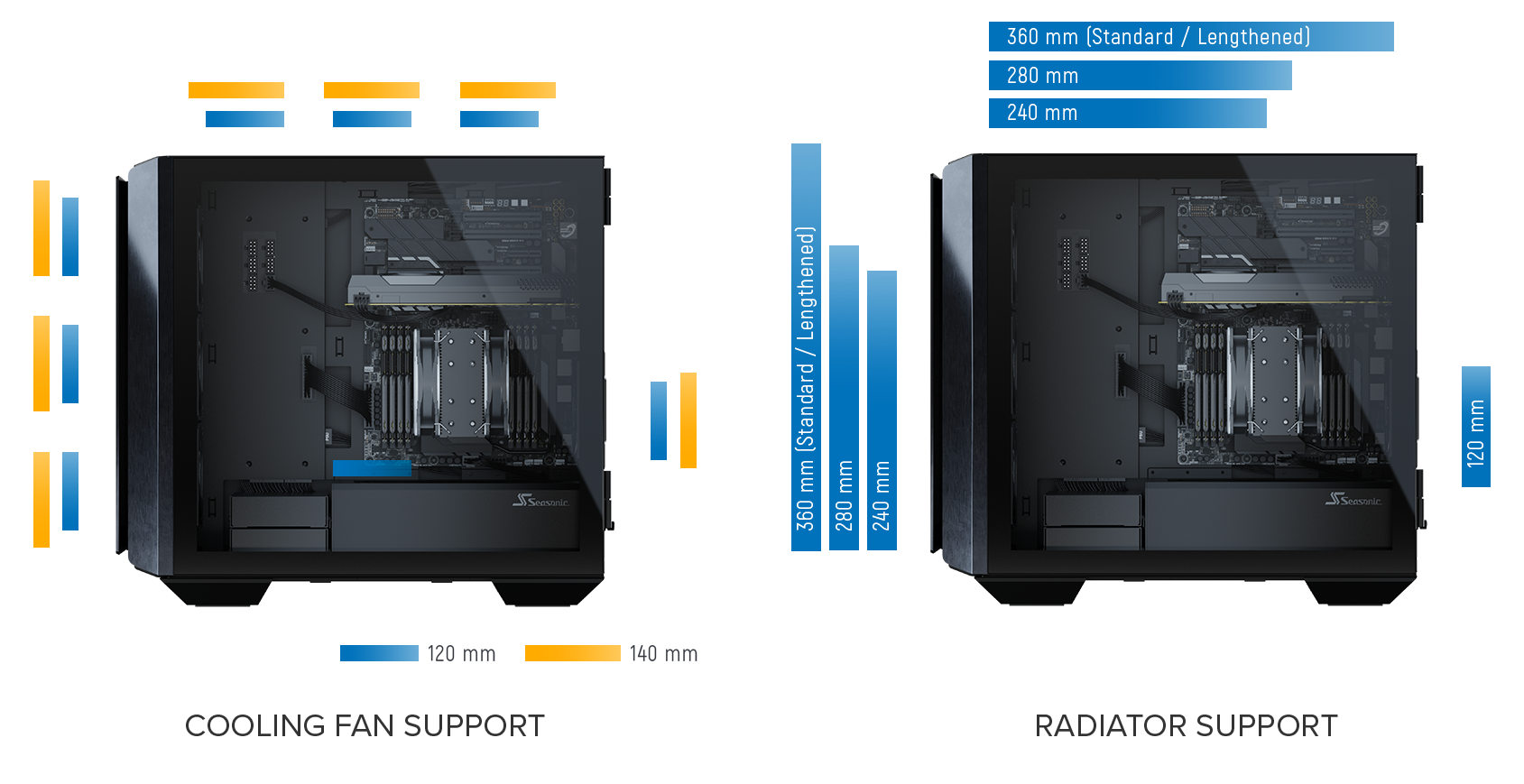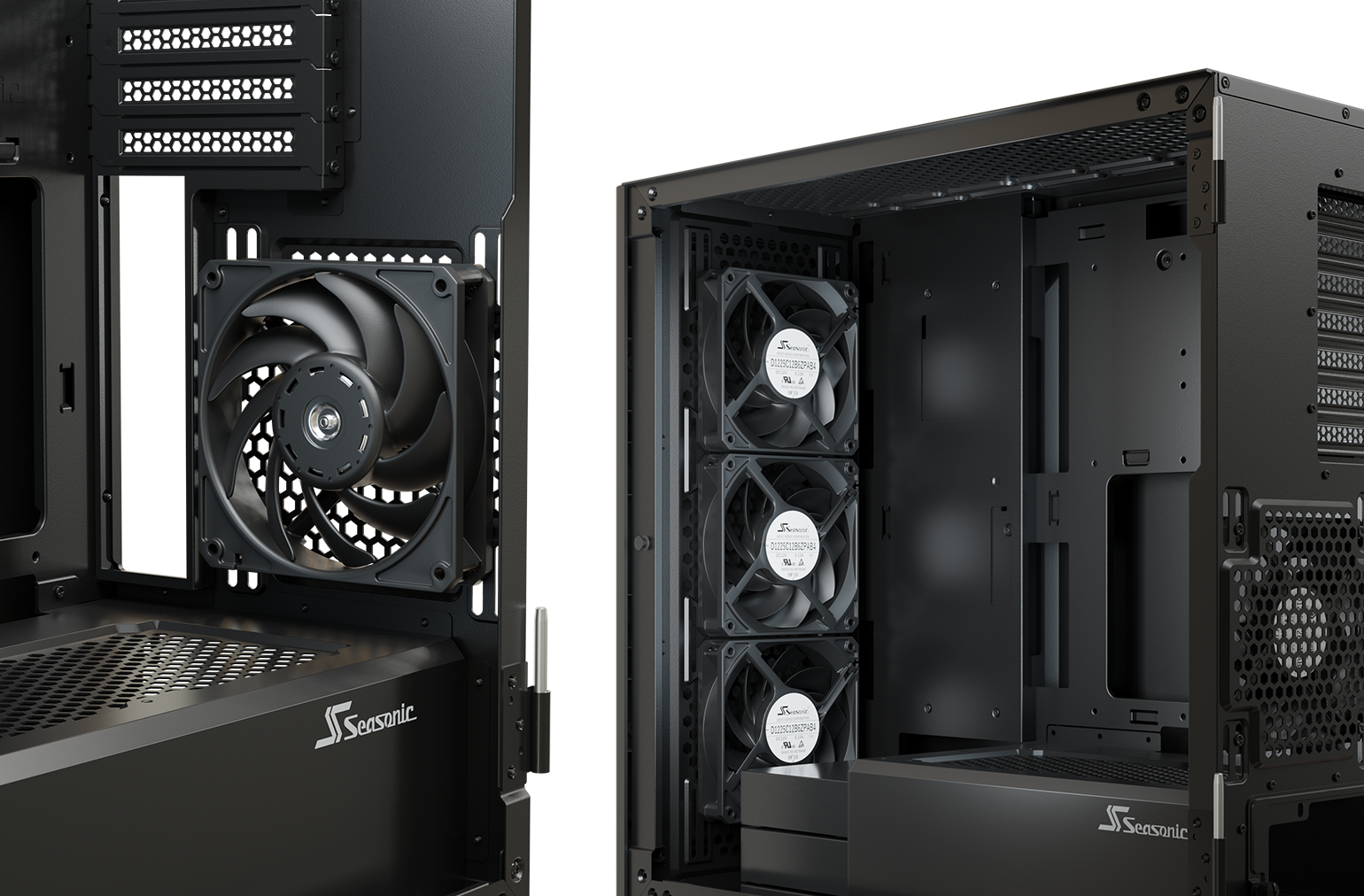 Zainstalowane fabrycznie cztery wysokowydajne wentylatory Seasonic z podwójnymi łożyskami kulkowymi zapewniają mocne, ale ciche chłodzenie. W przypadku rozszerzonych rozwiązań chłodzących można zainstalować do ośmiu wentylatorów chłodzących.