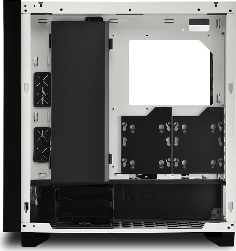 Sprzęt, który został wbudowany w budkę ELITE SHARK, zasługuje na to, by go zobaczyć. Dlatego wyposażyliśmy CA300H w dwa boczne panele ze szkła hartowanego. Lewy panel boczny zapewnia pełny wgląd do wnętrza, dzięki czemu zainstalowane elementy mogą być doskonale wyeksponowane. W przypadku prawego panelu bocznego, najniższy obszar hartowanego szkła jest zabarwiony na czarno, dzięki czemu części wewnątrz tunelu zasilającego nie odwracają uwagi od ogólnego efektu wizualnego skrzynki. Dyski SSD z elementami RGB lub imponujące dyski twarde wchodzą tutaj w grę. Sploty kabli nie mają szans: okablowanie można po prostu zniknąć w przestronnym przedziale kablowym, który można otwierać i zamykać, a także za ruchomą osłoną kabli. Aby nie mieć żadnych zbędnych elementów w polu widzenia, panele boczne montuje się bez śrub na ich powierzchni lub z tyłu i można je szybko i łatwo przymocować do ramy budki w kilku prostych krokach.