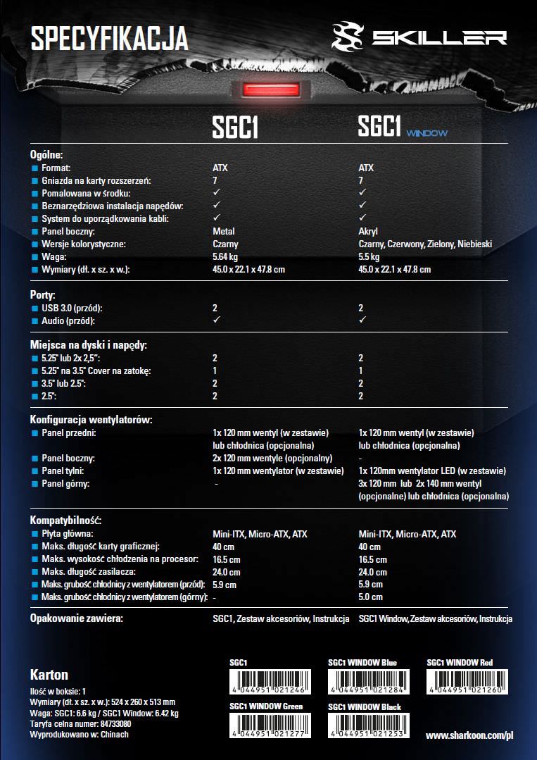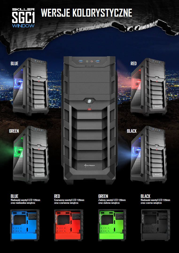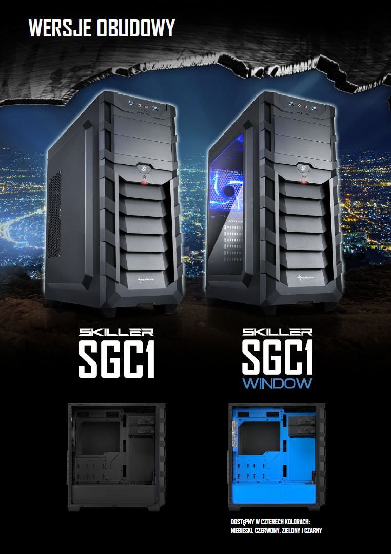 Niemiecki producent Sharkoon prezentuje nową serię obudów o nazwie Skiller SGC1. Wersja bez okna jest bardziej przeznaczona do komputerów biurowych, a wersja z oknem na kompy dla graczy, szczególnie dla takich którzy lubią cały zestaw trzymać na biurku, gdyż jest ona pomalowana na dany kolor w środku. Sharkoon Skiller SGC1 to nowoczesna dwu-komorowa konstrukcja. Oznacza to, że dyski i zasilacz mają osobny tunel powietrzny, przez co temperatury procesora i karty graficznej są niższe, a komputer może pracować bardziej stabilnie, a jeśli chcemy go podkręcić to także szybciej.
