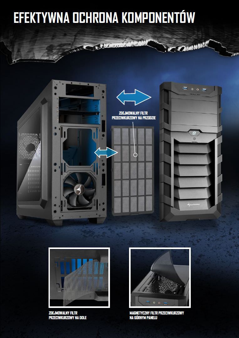 W środku znajdziemy sporo miejsca na różne komponenty. Obudowa pomieści karty graficzne o długości do 400mm oraz chłodzenie na procesor o wysokości do 165mm. Sharkoon Skiller SGC1 pomieści bez problemu najnowsze płyty główne ATX, microATX oraz Mini-ITX. W zestawie znajdziemy trzy wysokiej jakości filtry przeciwkurzowe, które chronią wnętrzności naszego komputera przed brudem. Dodatkowo wszystkie trzy są zdejmowalne, więc łatwo można je co jakiś czas przemyć.
