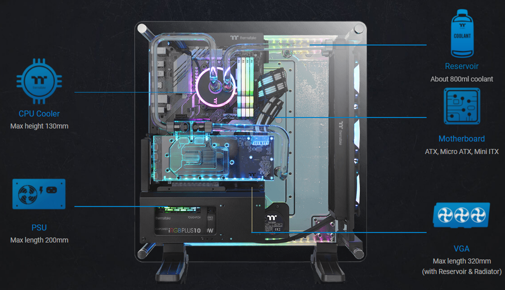 DistroCase™ 350P Mid Tower Chassis jest w pełni modułową obudową z płytą dystrybucyjną jako głównym korpusem, wykonaną z SPCC i PMMA. Ta wielofunkcyjna obudowa PC posiada własne kanały wodne, zbiornik (około 800 ml chłodziwa), fabrycznie zainstalowaną pompę D5 oraz wiele wlotów i wylotów. 48 diod LED w obudowie DistroCase™ 350P Mid Tower jest kompatybilnych z TT RGB PLUS i oprogramowaniem NeonMaker Light Editing Software. Poza tym użytkownicy mają również możliwość sterowania oświetleniem poprzez synchronizację obudowy z płytami głównymi, w tym ASUS Aura Sync, GIGABYTE RGB Fusion, MSI Mystic Light Sync i ASRock Polychrome. Obudowa DistroCase ™ 350P Mid Tower zapewnia użytkownikom, graczom i entuzjastom łatwiejszy sposób projektowania pętli wody, aby zapewnić najwyższą jakość obsługi.
