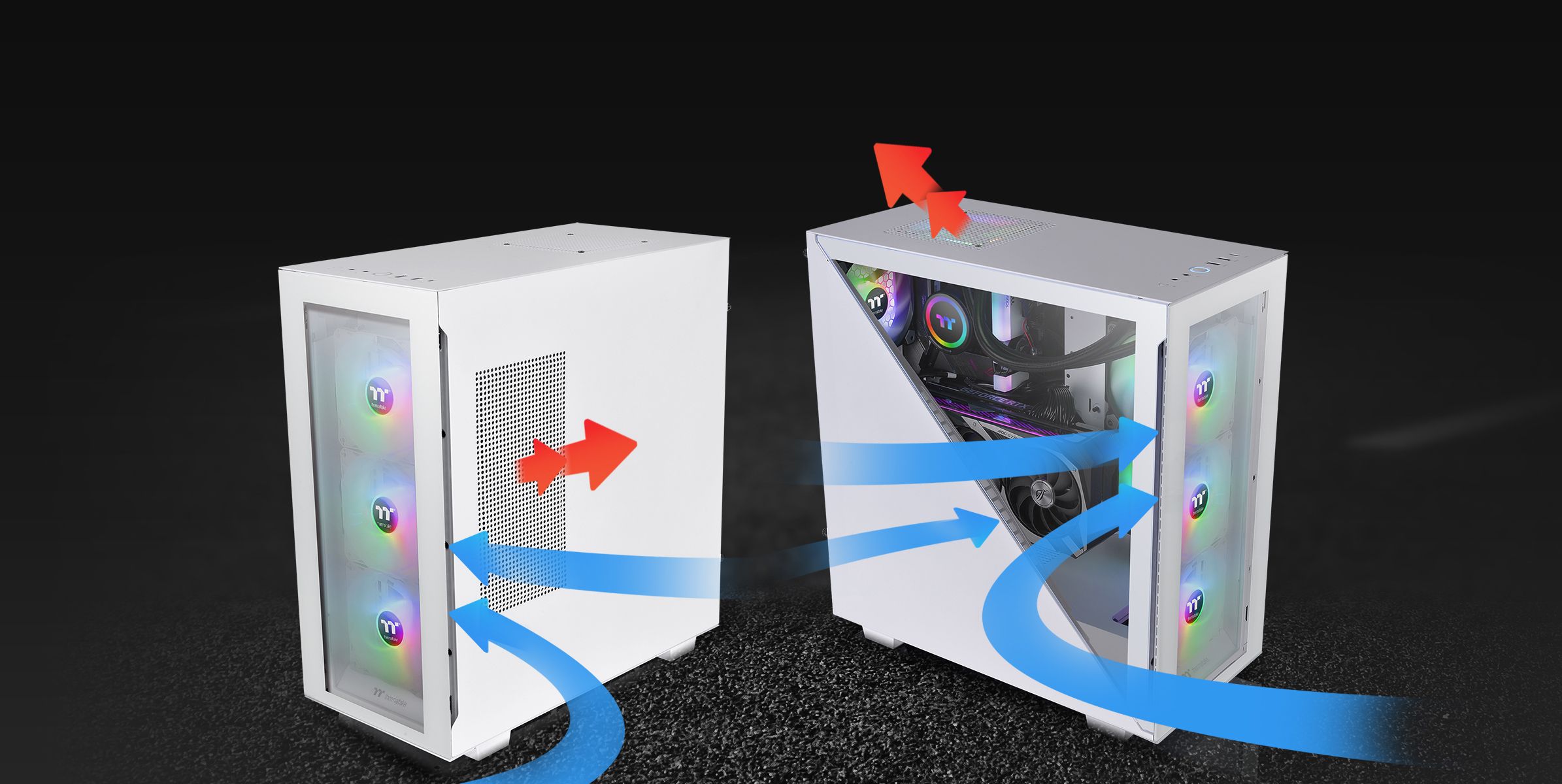 Wydajność chłodzenia Divider 300 TG Snow ARGB jest godna podziwu. Szczeliny wentylacyjne po obu stronach przedniej szyby hartowanej umożliwiają optymalny dopływ powietrza, a dodatkowe chłodzenie wylotu znajduje się w górnej i tylnej części obudowy.