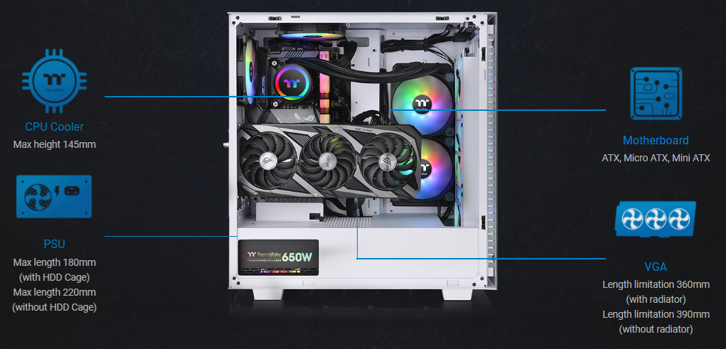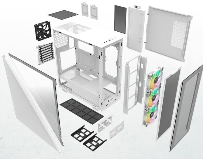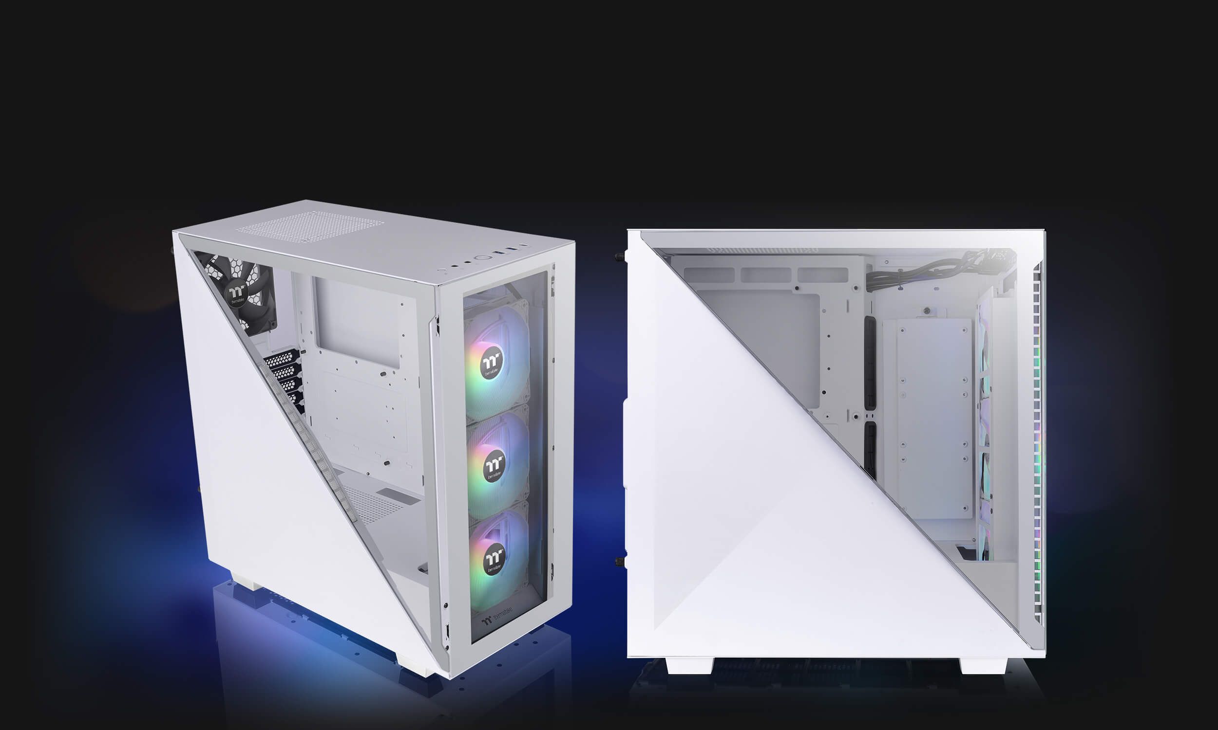 Thermaltake zaprojektował zupełnie nową serię obudów, która zawiera mieszankę elementów w stylu otwartej ramy i konfigurowalnych opcji, łącząc wszystkie funkcje serii Divider. Najbardziej wyjątkową cechą obudowy Divider 300 TG Snow ARGB Mid Tower są dwa symetryczne trójkątne elementy składające się ze stalowego panelu i hartowanego szkła. Panele te nie wymagają użycia narzędzi i są łatwe do zdjęcia oraz zapewniają wyraźny widok elementów znajdujących się wewnątrz.